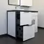 Напольная тумба-умывальник «Лозанна-120» с двумя вместительными выкатными ящиками, оснащенными системой плавного закрывания, обеспечивает возможность практичного хранения бытовой химии и белья для стирки. Фасады тумбы покрыты белой глянцевой эмалью. В модели используется стальной профиль, покрытый серой матовой эмалью.