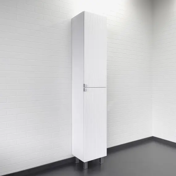 Напольная шкаф-колонна отличное решение для хранения разных предметов необходимых в ванной комнате. За верхней и нижней створками по три полки. Фасады изготовлены из МДФ декорированы вертикальной фрезеровкой и обтянуты в белую матовую пленку с эффектом Soft Touch. Дверцы могут быть подвешены как в правом, там и в левом исполнении. Петли оборудованы механизмами плавного закрывания.