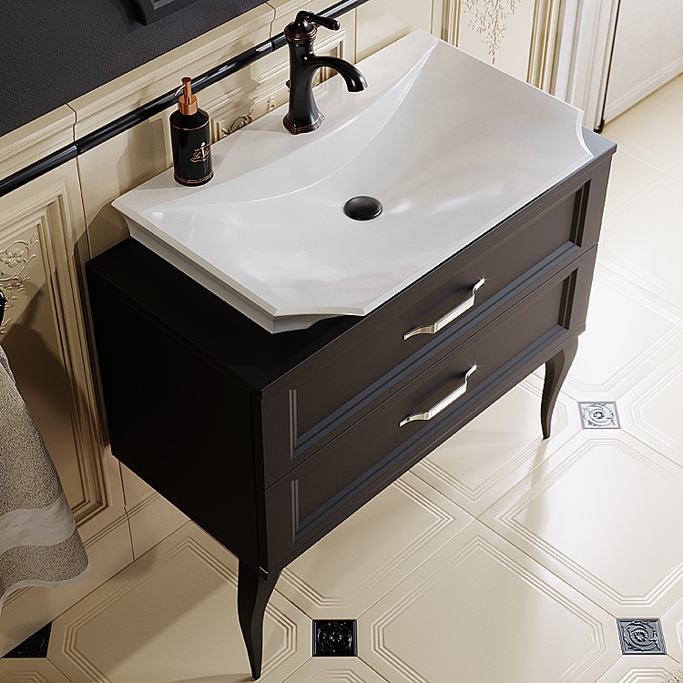 Напольная тумба AQWELLA 85 см с двумя ящиками в черном матовом цвете с умывальником из литьевого мрамора