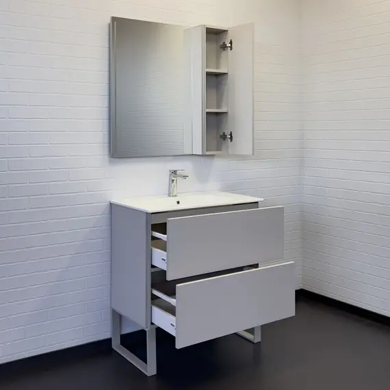 Напольная тумба-умывальник с двумя ящиками оборудованными направляющими с системой плавного закрывания. Открытие ящиков производится при помощи вертикальных профильных ручек интегрированных в боковые стенки тумбы. Ножки тумбы из металла защищены от воздействия влаги порошковой покраской. Тумбу можно использовать как подвесную, если не использовать ножки.