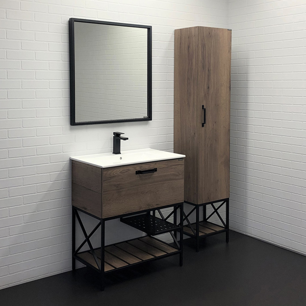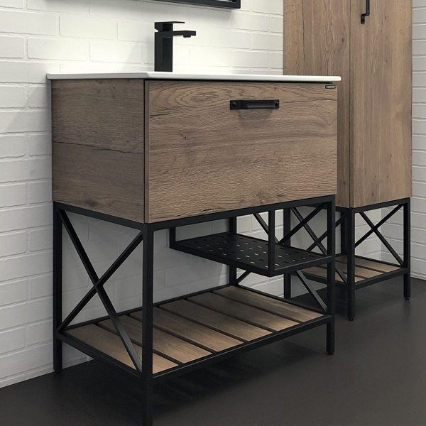 В комплекте белая раковина с прямоугольной чашей. В основе тумбы - каркас из стального профиля окрашенный черной эмалью с нижней широкой полкой и средней полкой для полотенец. Стильная ручка ящика в том же цвете что и каркас. Тумба подготовлена для подключения водоснабжения снизу.