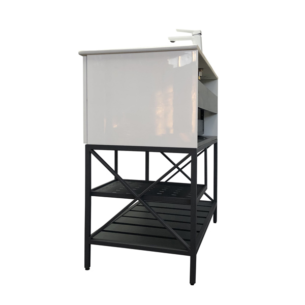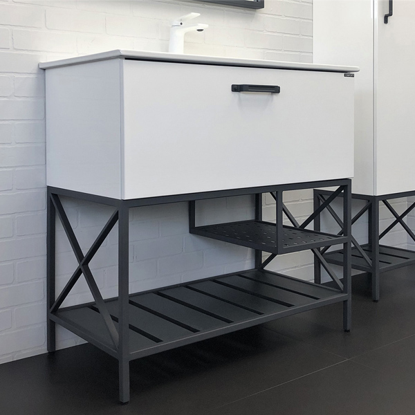 В комплекте керамическая раковина с прямоугольной чашей. В основе тумбы - каркас из стального профиля окрашенный эмалью серый графит с нижней широкой полкой и средней полкой для полотенец. Стильная ручка ящика в том же цвете что и каркас. Тумба подготовлена для подключения водоснабжения снизу.