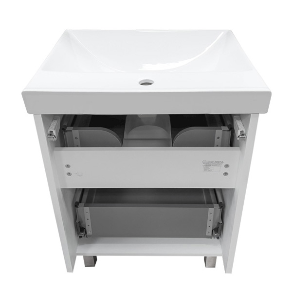 Корпус и фасады изготовлены из МДФ и покрыты белой глянцевой эмалью. Тумба укомплектована раковиной Comforty 8056 c чашей прямоугольной формы.