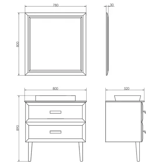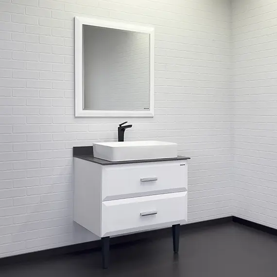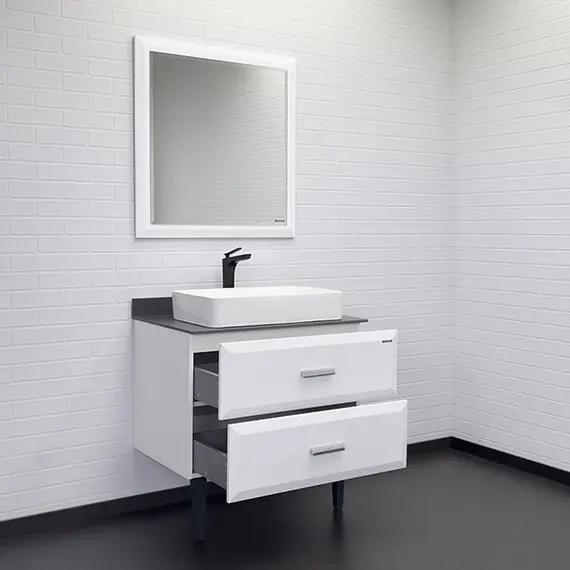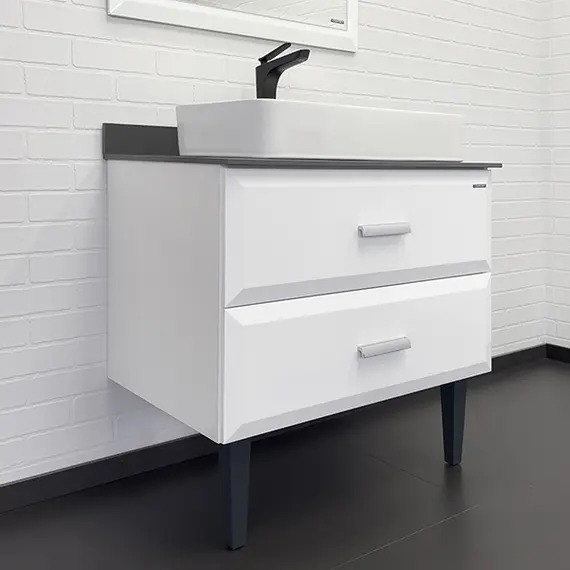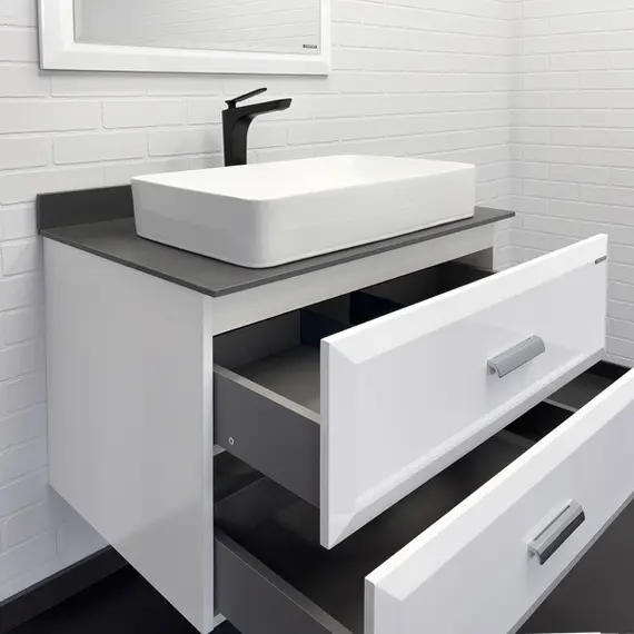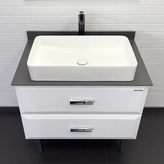 Тумба укомплектована столешницей и бортиком из керамогранита цвета графит и накладной раковиной Comforty 78189. Тумба подготовлена для подключения водоснабжения снизу.