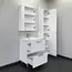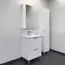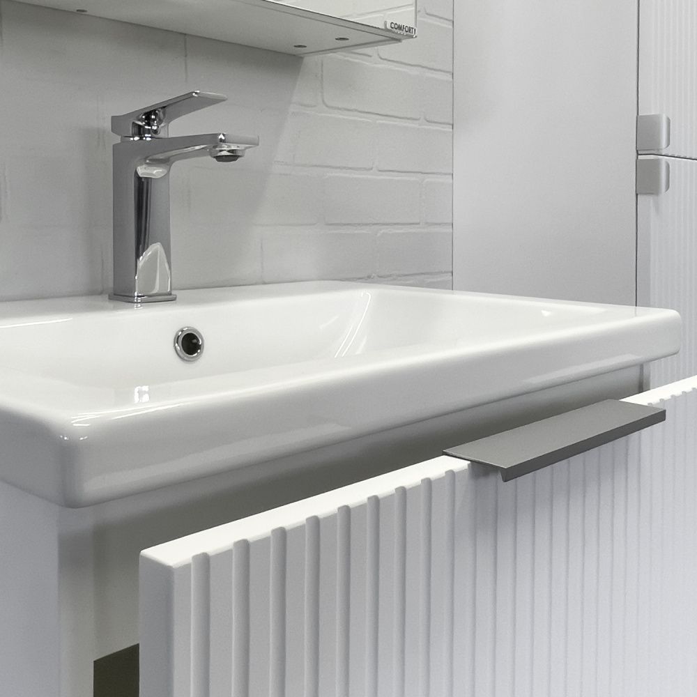 Напольная тумба-умывальник с двумя выдвижными ящиками декорированными вертикальной фрезеровкой. Ящики оснащены направляющими с механизмами плавного закрывания. В модели применяется плёнка белого цвета с эффектом Soft-Touch. Тумба подготовлена для подключения коммуникаций снизу и сзади.