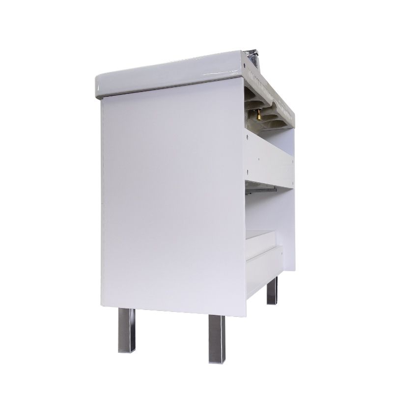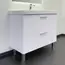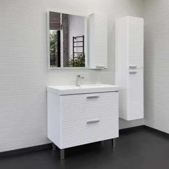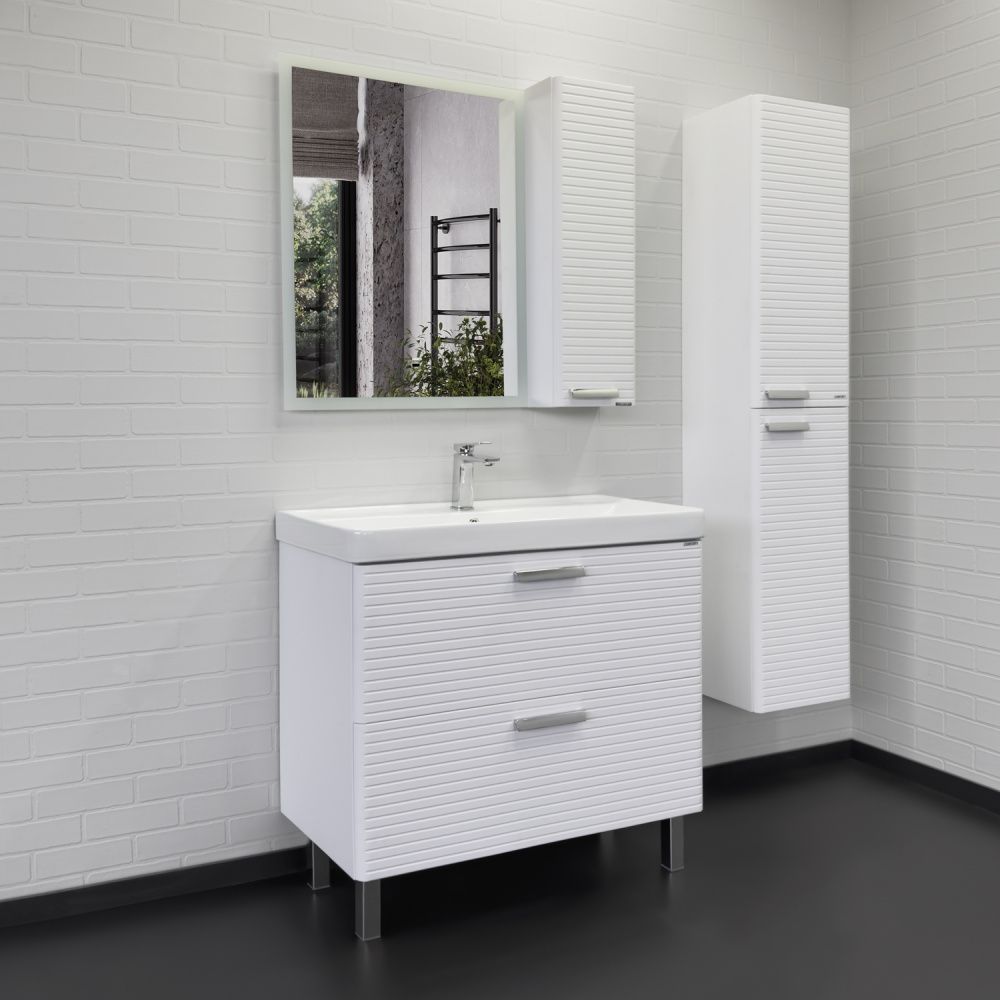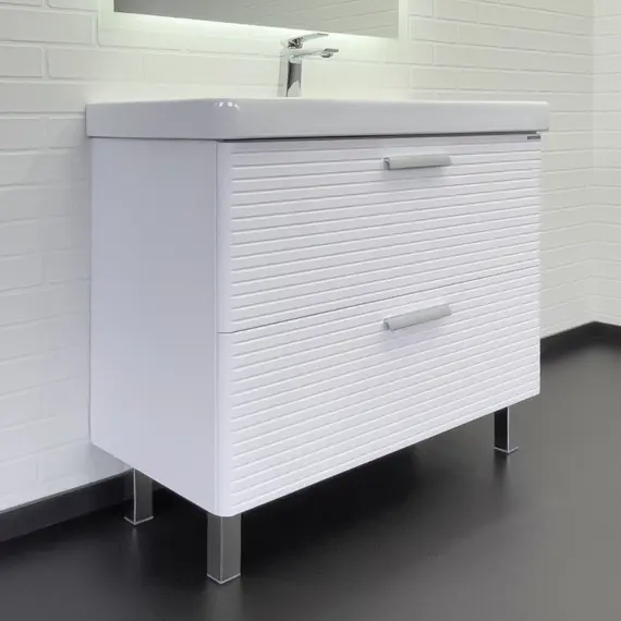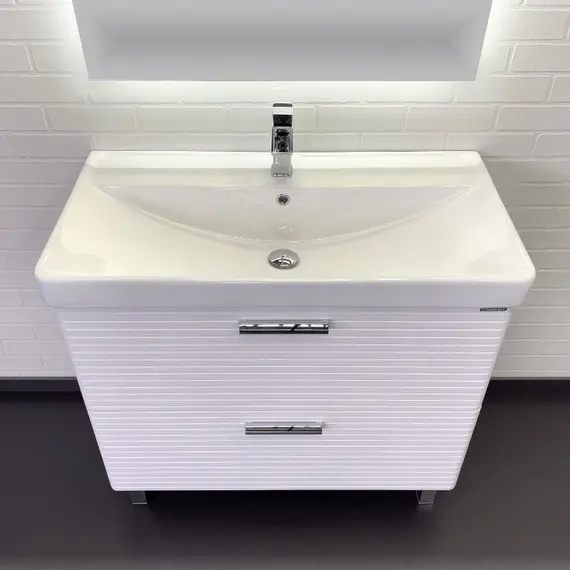 Напольная тумба с двумя выдвижными ящиками оснащенными направляющими с системой плавного закрывания. Оригинальные эргономичные ручки цвета хром. Фасады тумбы изготовлены из МДФ, фрезерованы горизонтальным узором и облицованы белой матовой пленкой. Тумба подготовлена для подключения водоснабжения снизу и сзади.