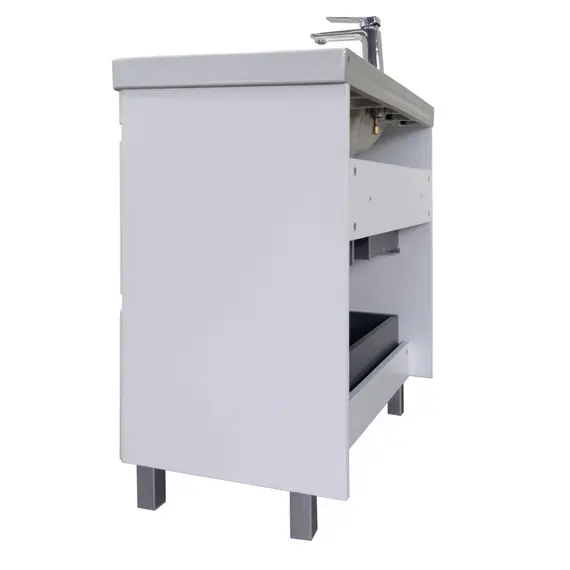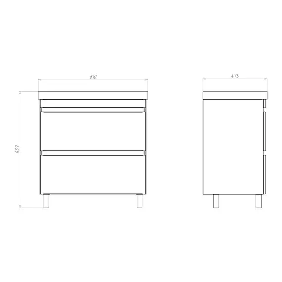 Напольная тумба с двумя большими выдвижными ящиками. Направляющие ящиков оборудованы системой плавного закрывания. Лицевая фурнитура на фасаде отсутствует, для открытия ящика нужно потянуть верхний край фасада, на котором сделан вырез под естественный хват. Прорези в фасаде декорированы алюминиевым профилем. Ящики выполнены из ВЛДСП контрастного цвета серый уголь. Тумба подготовлена для подключению коммуникаций снизу и сзади.