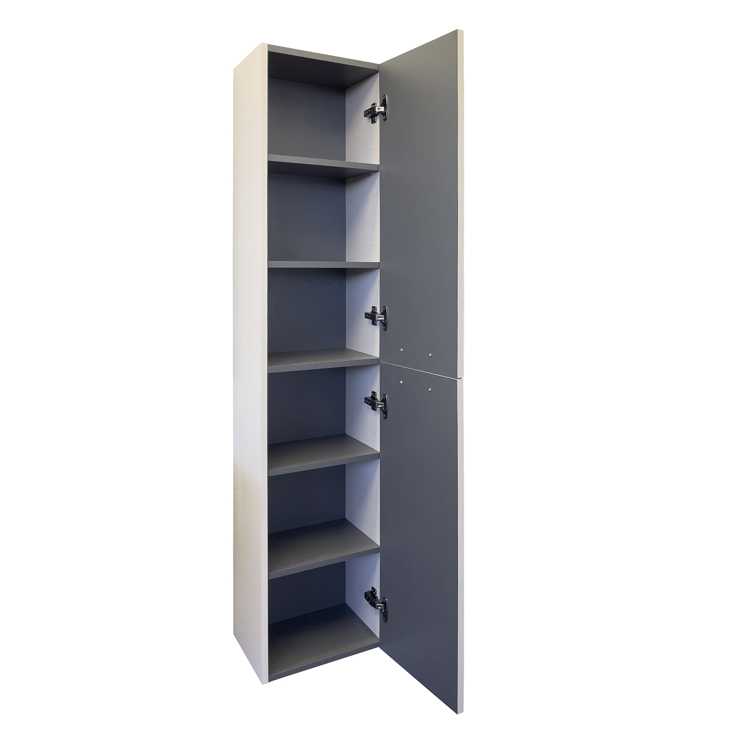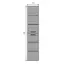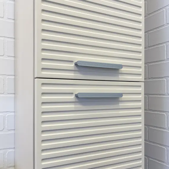 Подвесная шкаф колонна с двумя створками. Створки оснащены петлями с плавным закрыванием и серыми матовыми алюминиевыми ручками. Корпус шкаф-колонны изготовлены из влагостойкого ЛДСП. Фасад пенала из МДФ фрезерован горизонтальным узором и обтянут в пленку цвета серый шёлк. Шкаф-колонна универсальна, фасады могут быть установлены как с левой, так и с правой стороны.