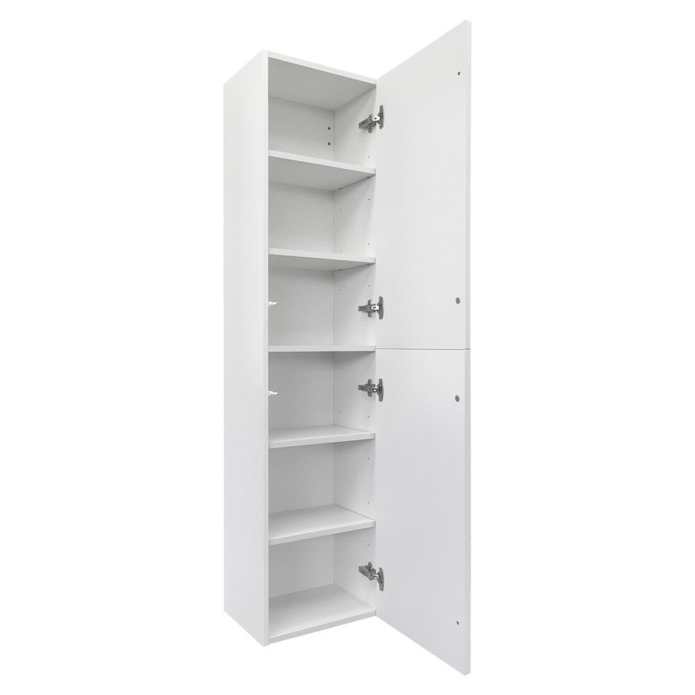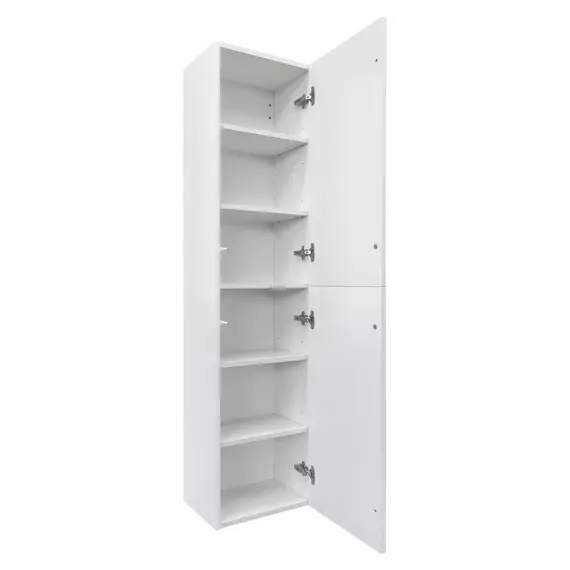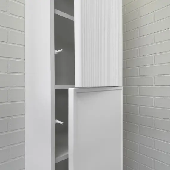 Подвесная шкаф колонна с двумя створками. Створки с системой открывания push to open. Корпус шкаф-колонны изготовлены из влагостойкого ЛДСП. Фасады пенала из МДФ фрезерованы кантом по периметру. Корпус и фасад колонны окрашены белой матовой эмалью. Шкаф-колонна универсальна, фасады могут быть установлены как с левой, так и с правой стороны.