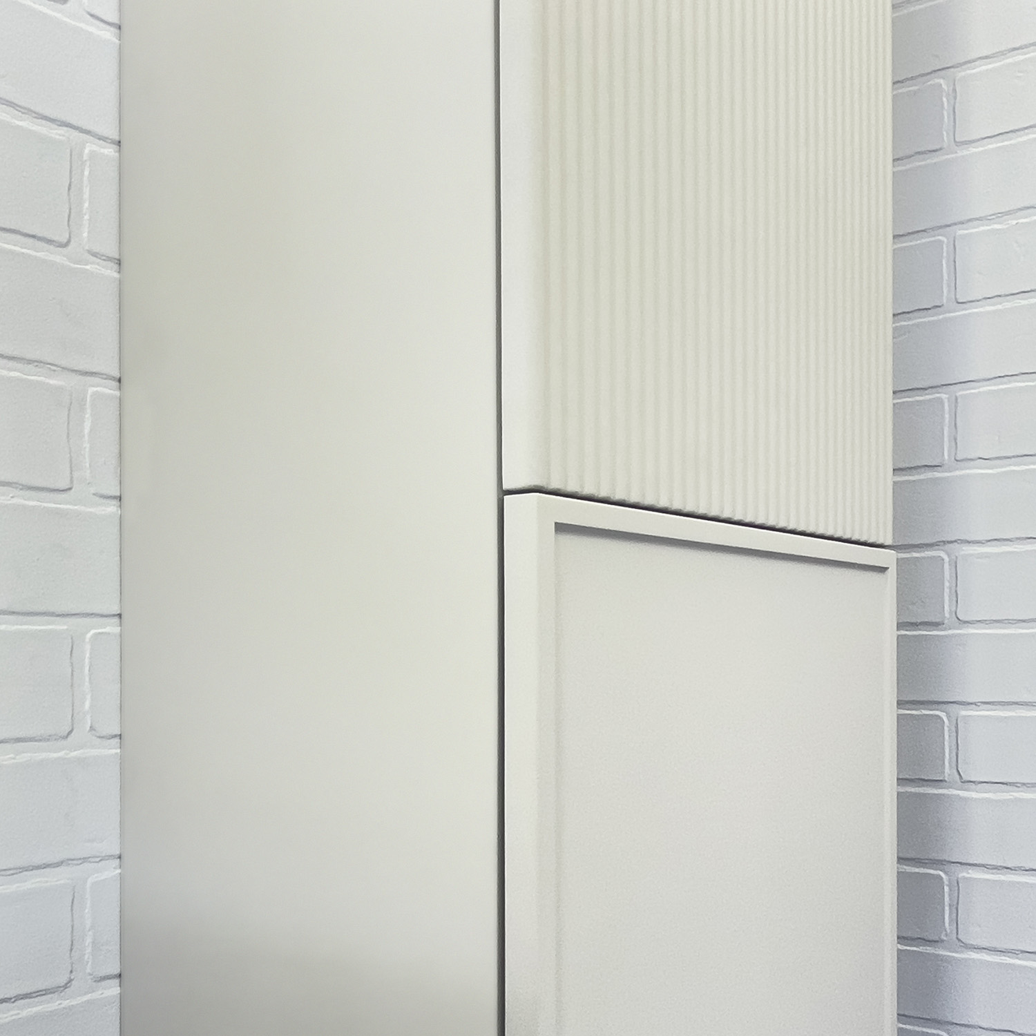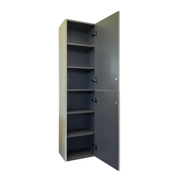 Подвесная шкаф колонна с двумя створками. Створки с системой открывания push to open. Корпус шкаф-колонны изготовлены из влагостойкого ЛДСП. Фасады пенала из МДФ фрезерованы кантом по периметру. Корпус и фасад колонны затянуты в матовую пленку цвета серый шёлк. Шкаф-колонна универсальна, фасады могут быть установлены как с левой, так и с правой стороны.