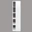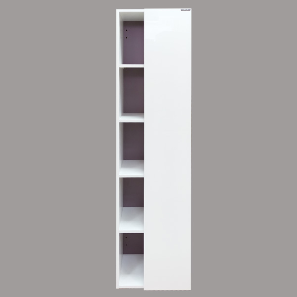 Подвесная шкаф колонна с одной створкой и пространством для открытого хранения. Створка оснащена петлями с плавным закрыванием. Фасад из МДФ покрыт белой глянцевой эмалью. За створкой три горизонтальные полки.