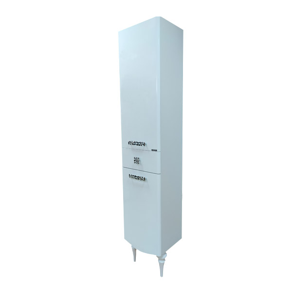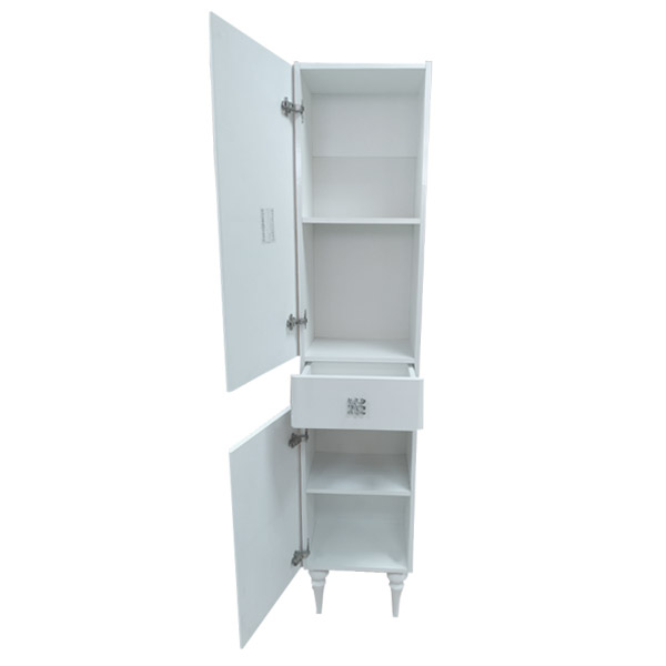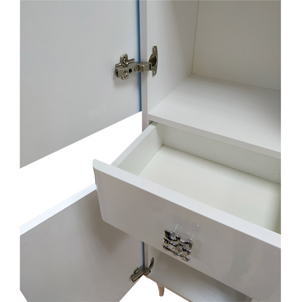 Створки открываются влево, оснащены петлями с плавным закрыванием. Фасады покрыты белой глянцевой эмалью. За верхней и нижней дверцей по одной полке.
