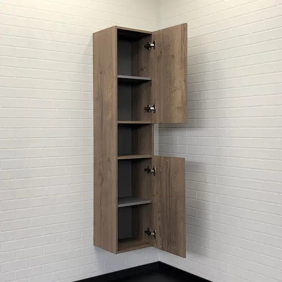 Корпус и фасады из влагостойкого ЛДСП дуб темный. За створками по две регулируемые по высоте полки.