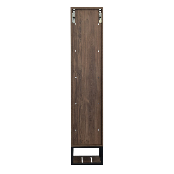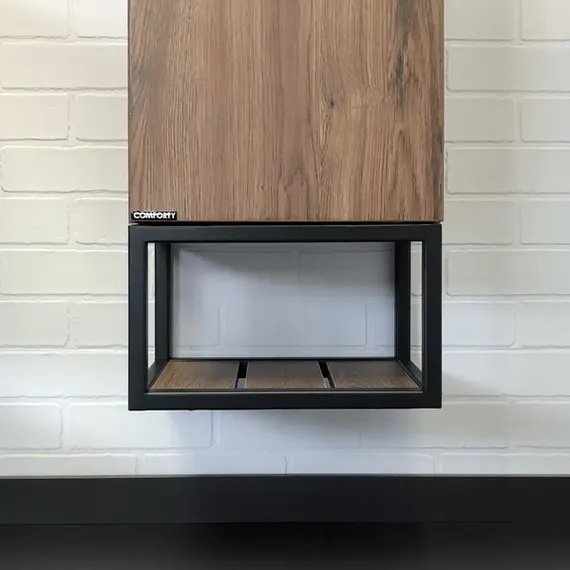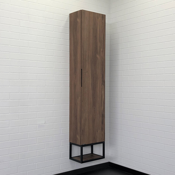 подвесной шкаф - со створкой и пространством для открытого хранения. Фасад и корпус из влагостойкого ЛДСП. Пространство открытого хранения на основе - металлическая рама из окрашенного в черный цвет металла. Петли створки с механизмами плавного закрывания. Створка может быть подвешена с правым или левым расположением петель.