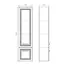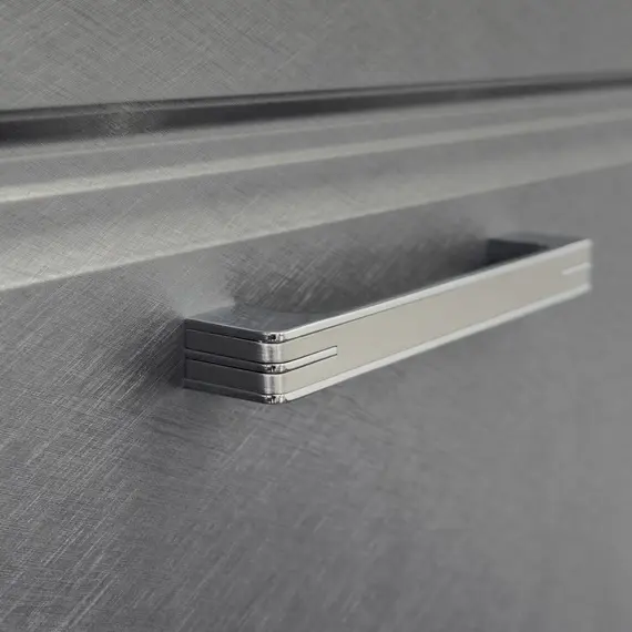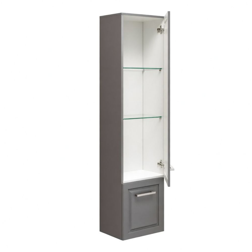 Подвесная шкаф-колонна шириной 40 см с двумя распашными створками. Фасад створок декорированы фрезеровкой по контуру. Петли створок оснащены механизмами плавного закрывания. За верхней створкой две стеклянные полки из закаленного стекла. Ручки колонны из цинкового сплава с повторением эффекта браширования. В модели применяется матовая плёнка цвета оружейная сталь с эффектом браширования. Створки могут быть подвешены с правым или левым расположением петель.