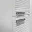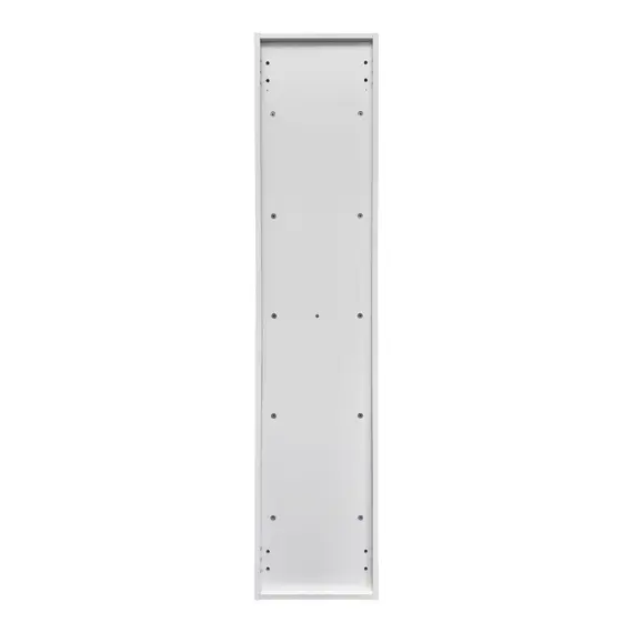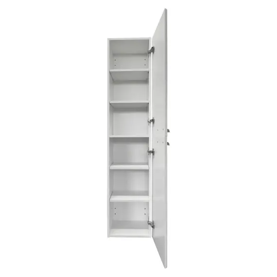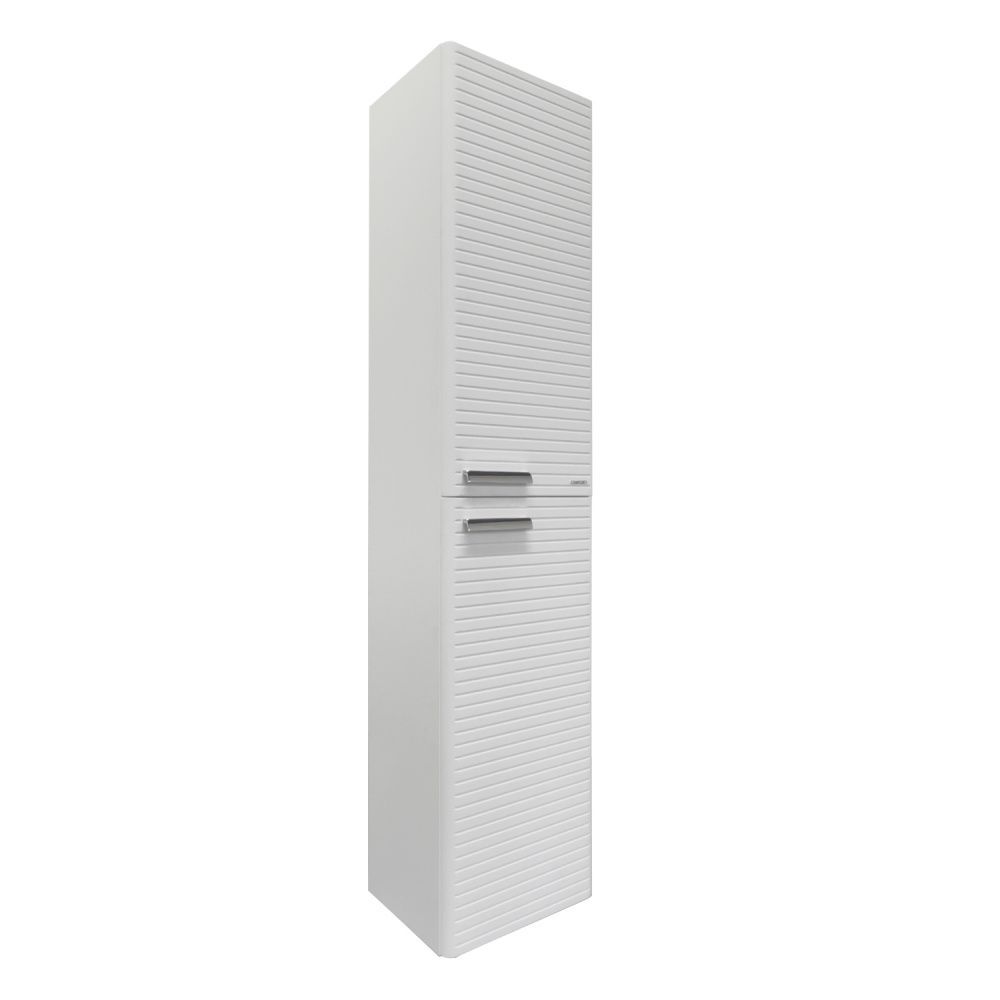 Подвесная шкаф-колонна отличное решение для хранения разных предметов необходимых в ванной комнате. Фасад створок декорированы горизонтальной линейной фрезеровкой. Боковые стенки и фасады пенала облицованы белой матовой пленкой с эффектом SoftTouch. Оригинальные эргономичные ручки цвета хром. За верхней дверцей и нижней створками по две регулируемые полки. Петли оборудованы механизмами плавного закрывания.