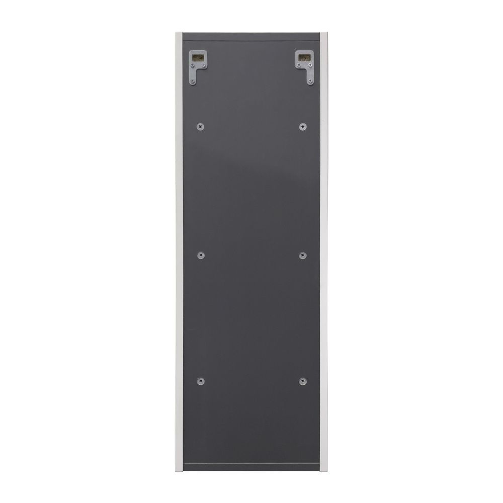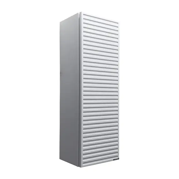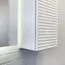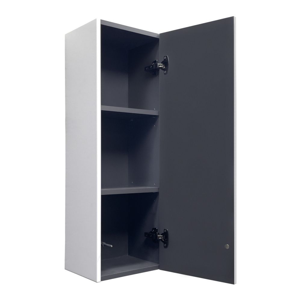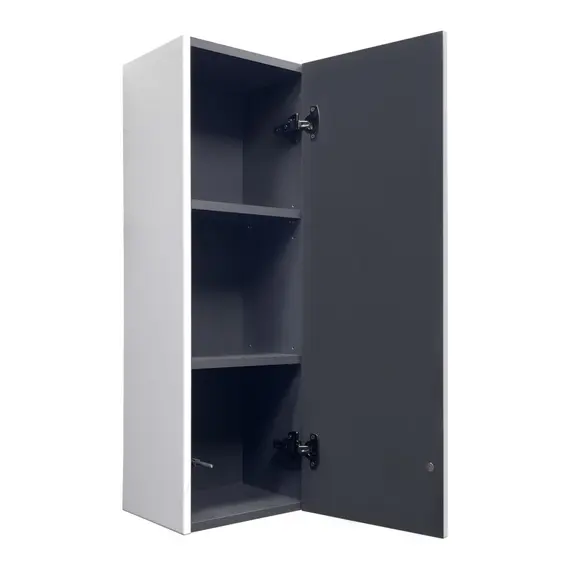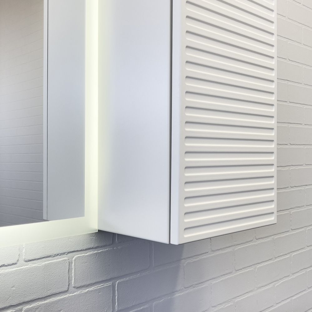 подвесной шкаф с одной распашной створкой. Система открывания push to open. Фасад декорирован горизонтальными профильными пазами и окрашен белой матовой эмалью. За створкой 2 горизонтальные полки. Шкаф универсален, может быть подвешен в правом и левом варианте.
