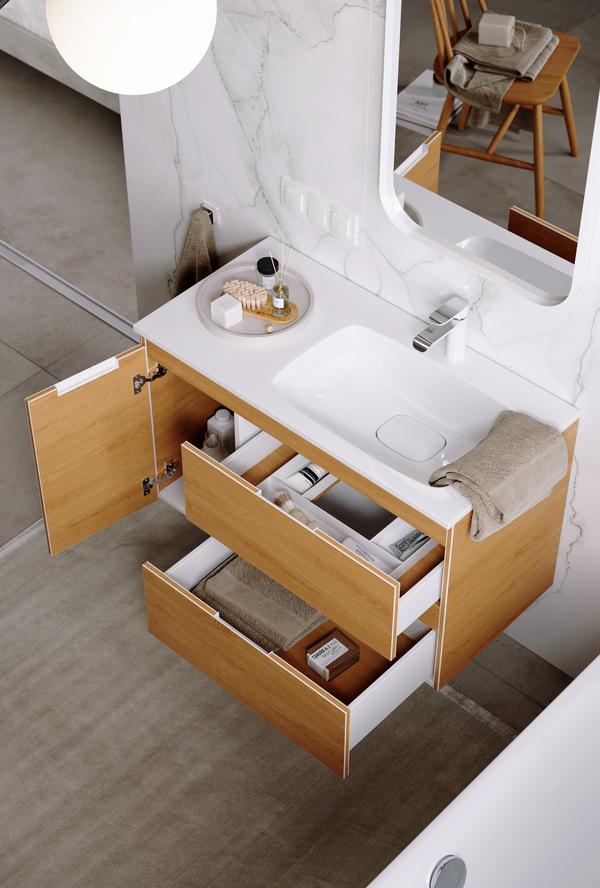 Подвесная тумба с двумя ящиками и одной дверью AQWELLA 90 см в цвете дуб золотой (чаша справа)