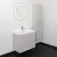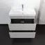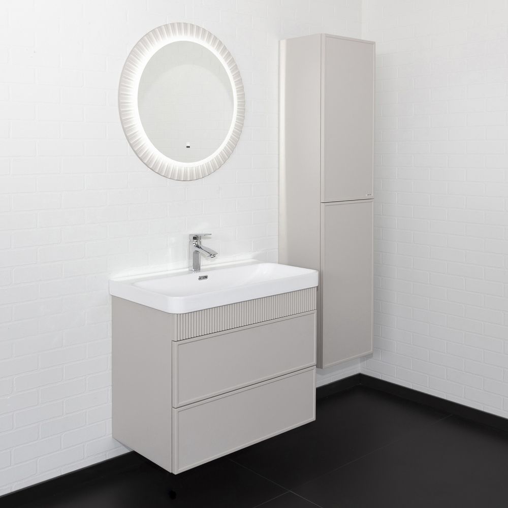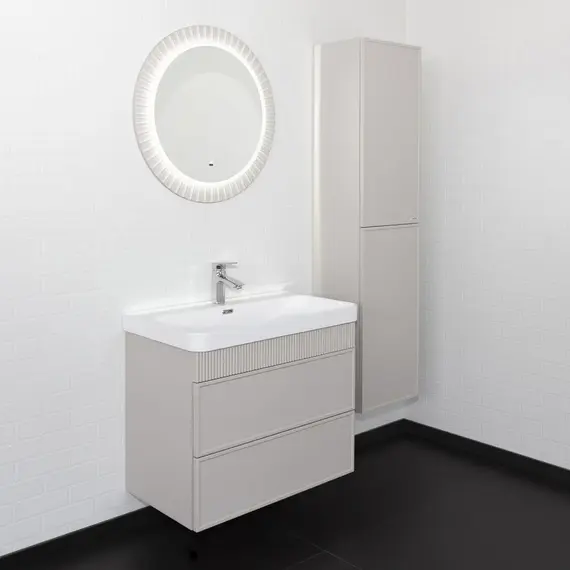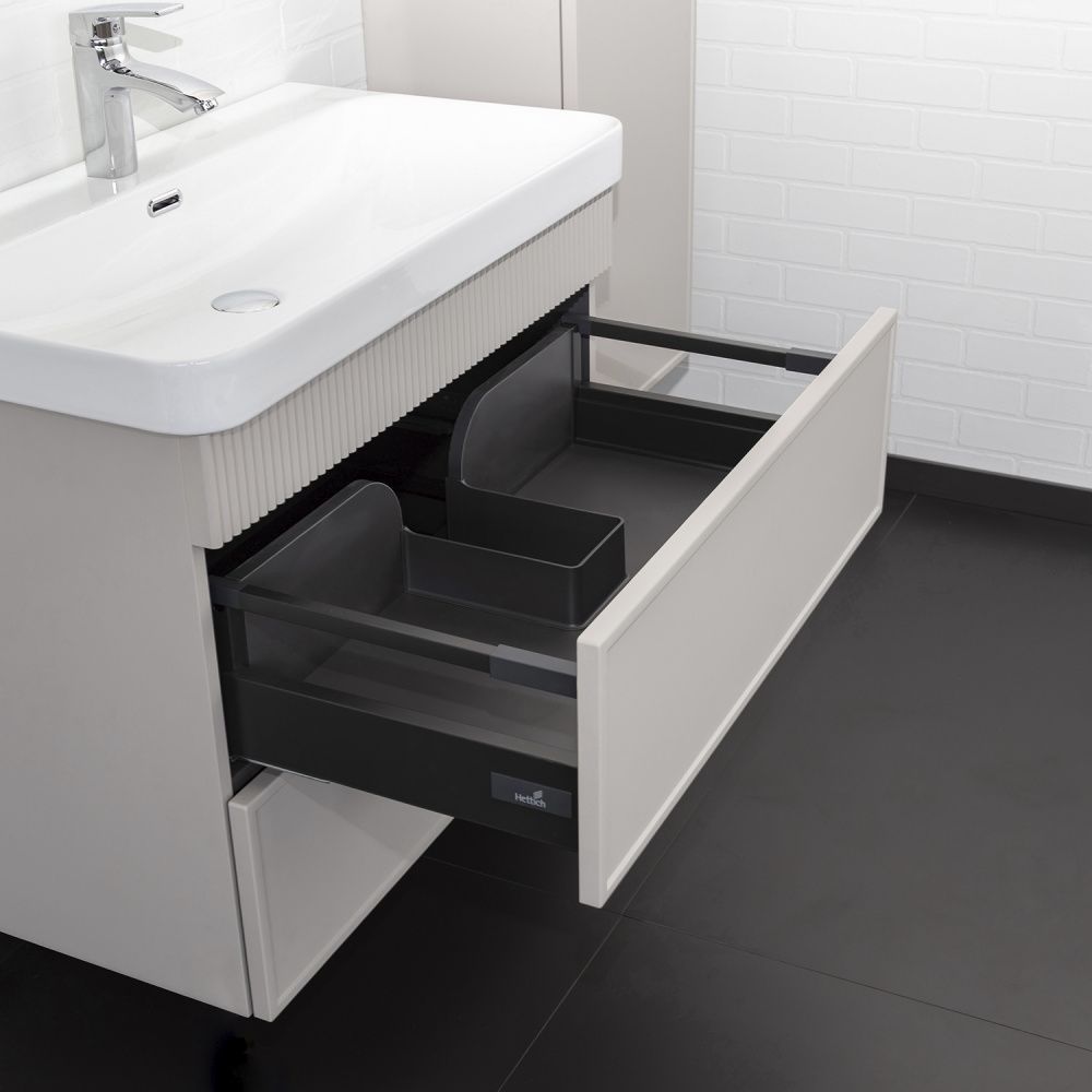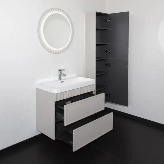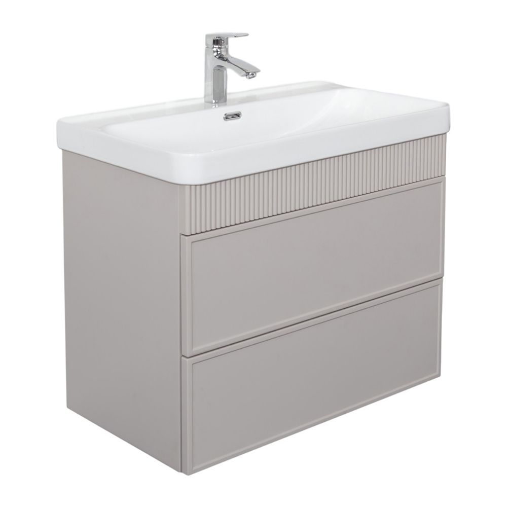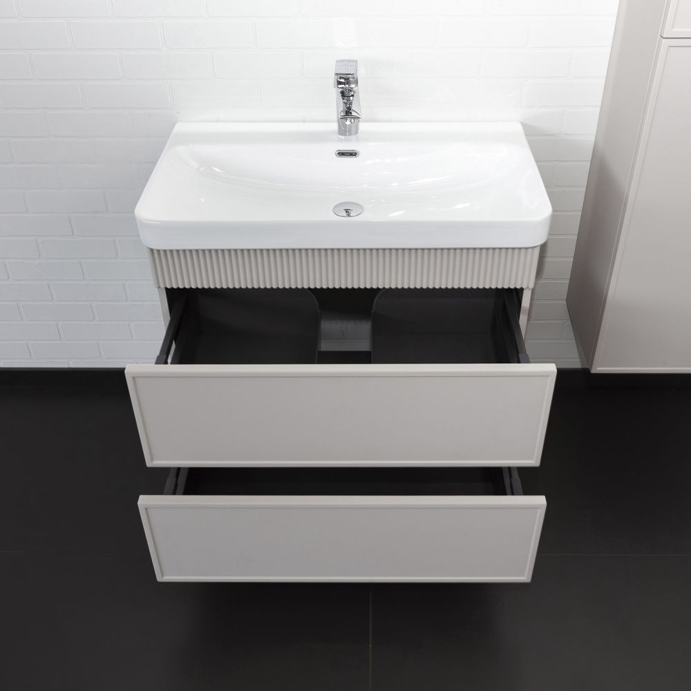 Подвесная тумба с двумя вместительными выкатными ящиками оборудованным направляющими с системой плавного закрывания. Корпус тумбы изготовлены из влагостойкого ЛДСП. Фасады тумбы из МДФ фрезерованы кантом по периметру. Подпорная царга фрезерована вертикальным узором. Корпус и фасады тумбы затянуты в матовую пленку цвета серый шёлк. Тумба подготовлена для подключения водоснабжения снизу и сзади.