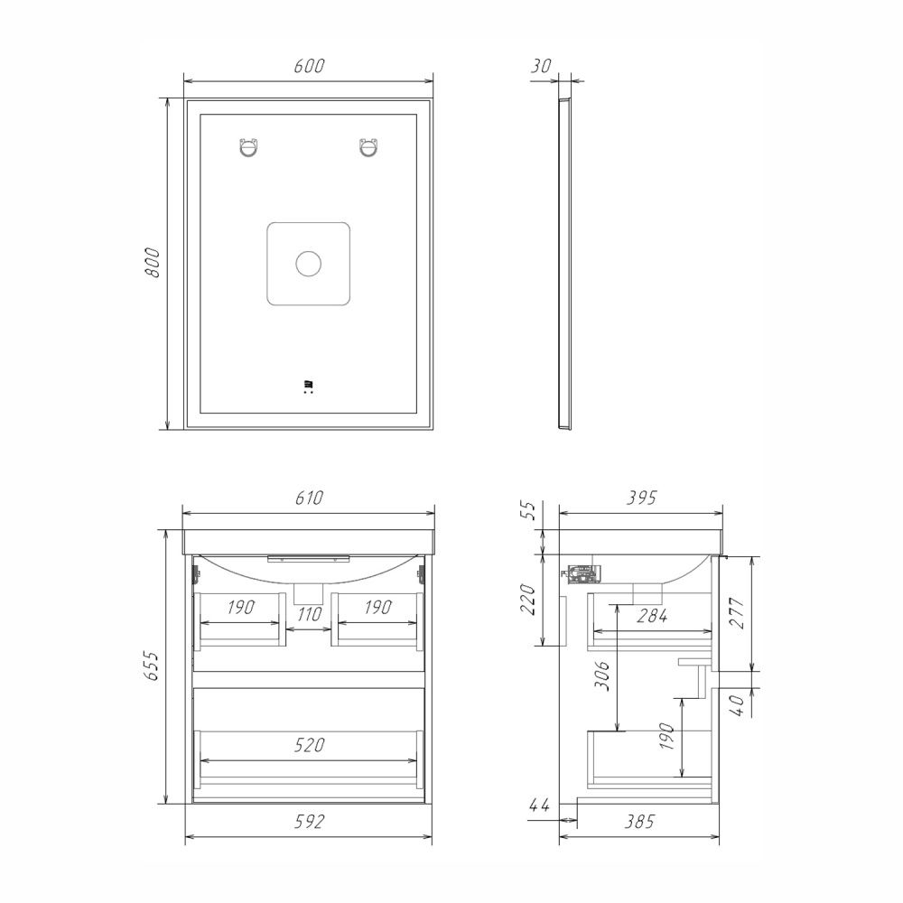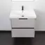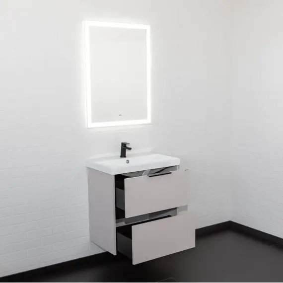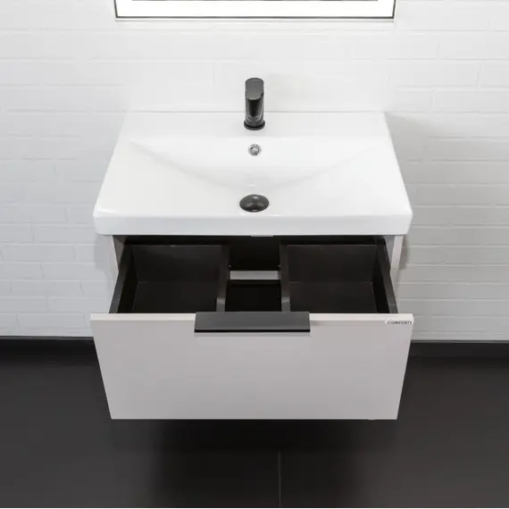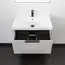 Подвесная тумба шириной 60 см с двумя вместительными выдвижными ящиками. Направляющие ящиков оборудованы системой плавного закрывания. Верхний ящик открывается черной профильной ручкой. Ручку устанавливать не обязательно. Верхний ящик можно открыть за нижний край фасада. Для открытия нижнего ящика нужно потянуть верхний край фасада. Ящики выполнены из ВЛДСП контрастного черного цвета. Тумба подготовлена для подключению коммуникаций снизу и сзади.