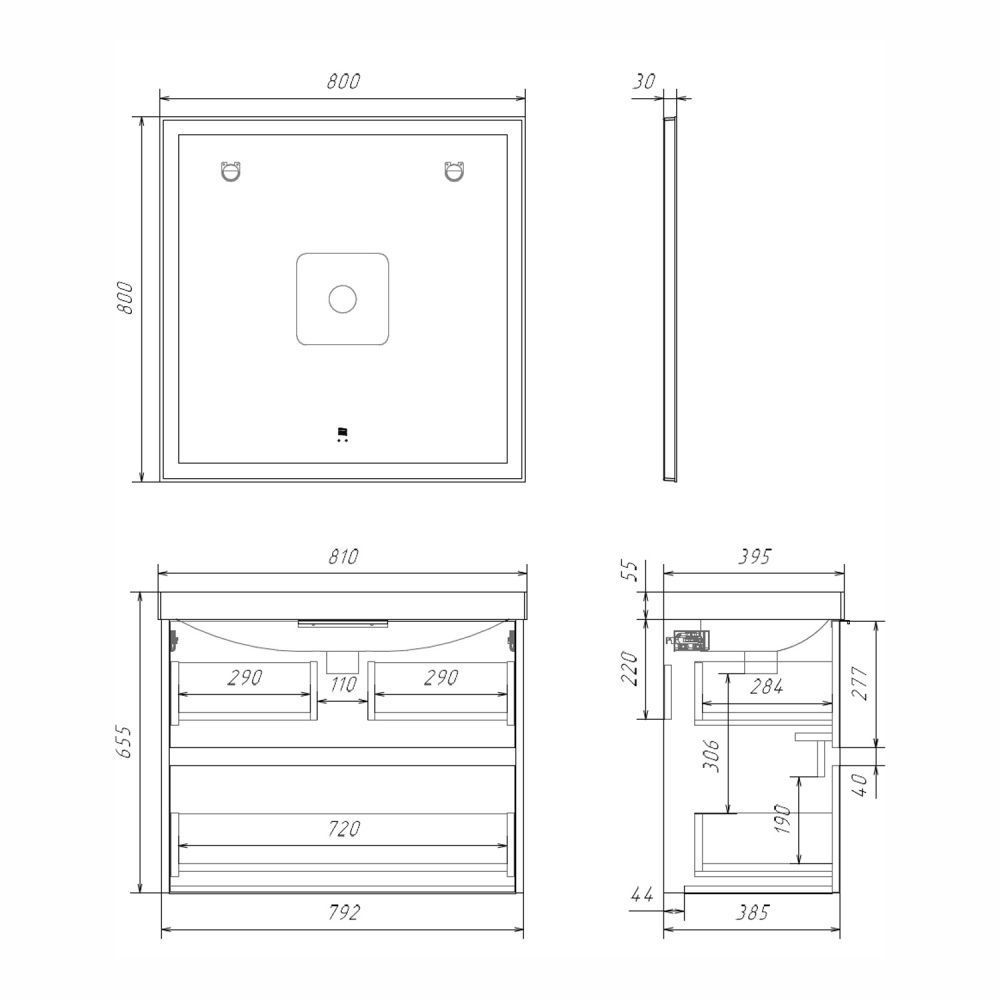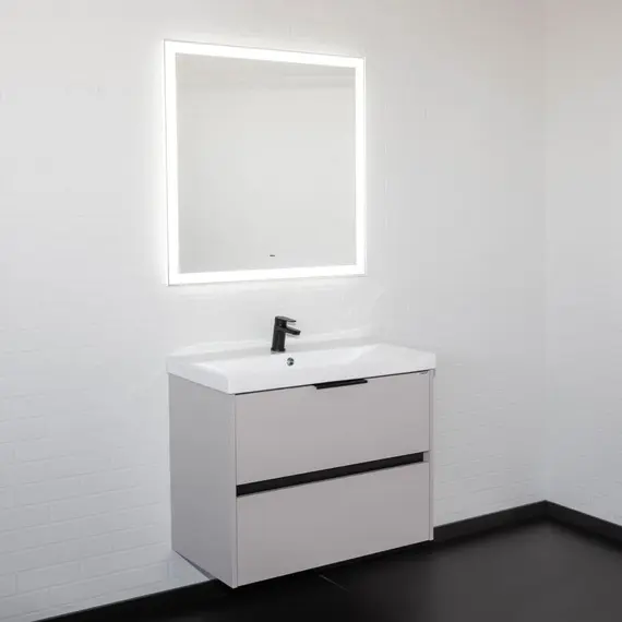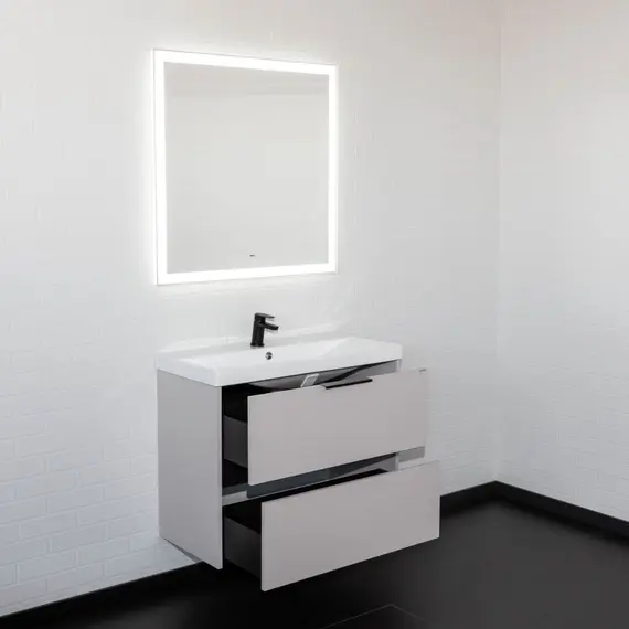 Подвесная тумба шириной 80 см с двумя вместительными выдвижными ящиками. Направляющие ящиков оборудованы системой плавного закрывания. Верхний ящик открывается черной профильной ручкой. Ручку устанавливать не обязательно. Верхний ящик можно открыть за нижний край фасада. Для открытия нижнего ящика нужно потянуть верхний край фасада. Ящики выполнены из ВЛДСП контрастного черного цвета. Тумба подготовлена для подключению коммуникаций снизу и сзади.