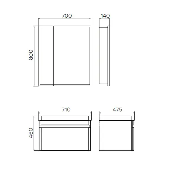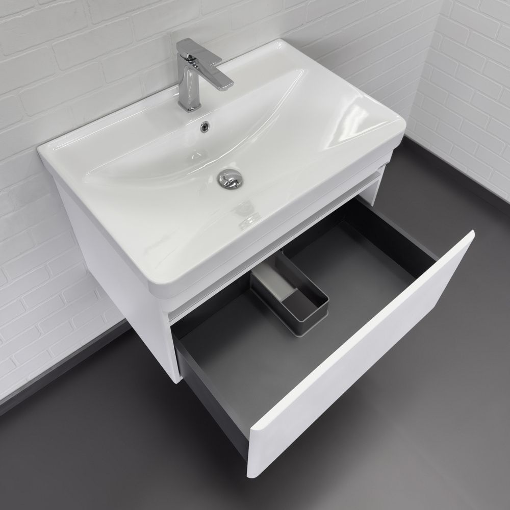 Подвесная тумба шириной 70 см с одним выдвижным ящиком. Направляющие ящика оборудованы системой плавного закрывания. Лицевая фурнитура на фасаде отсутствует, для открытия ящика нужно потянуть верхний край фасада, на котором сделан вырез под естественный хват. Прорезь в фасаде декорирована алюминиевым профилем. Ящик выполнен из ВЛДСП контрастного цвета серый уголь. Тумба подготовлена для подключению коммуникаций снизу и сзади.