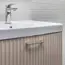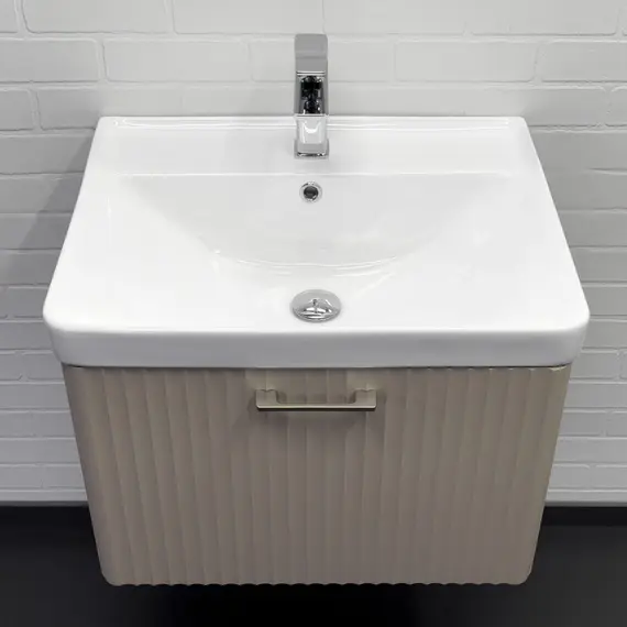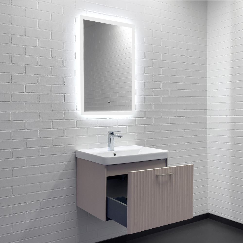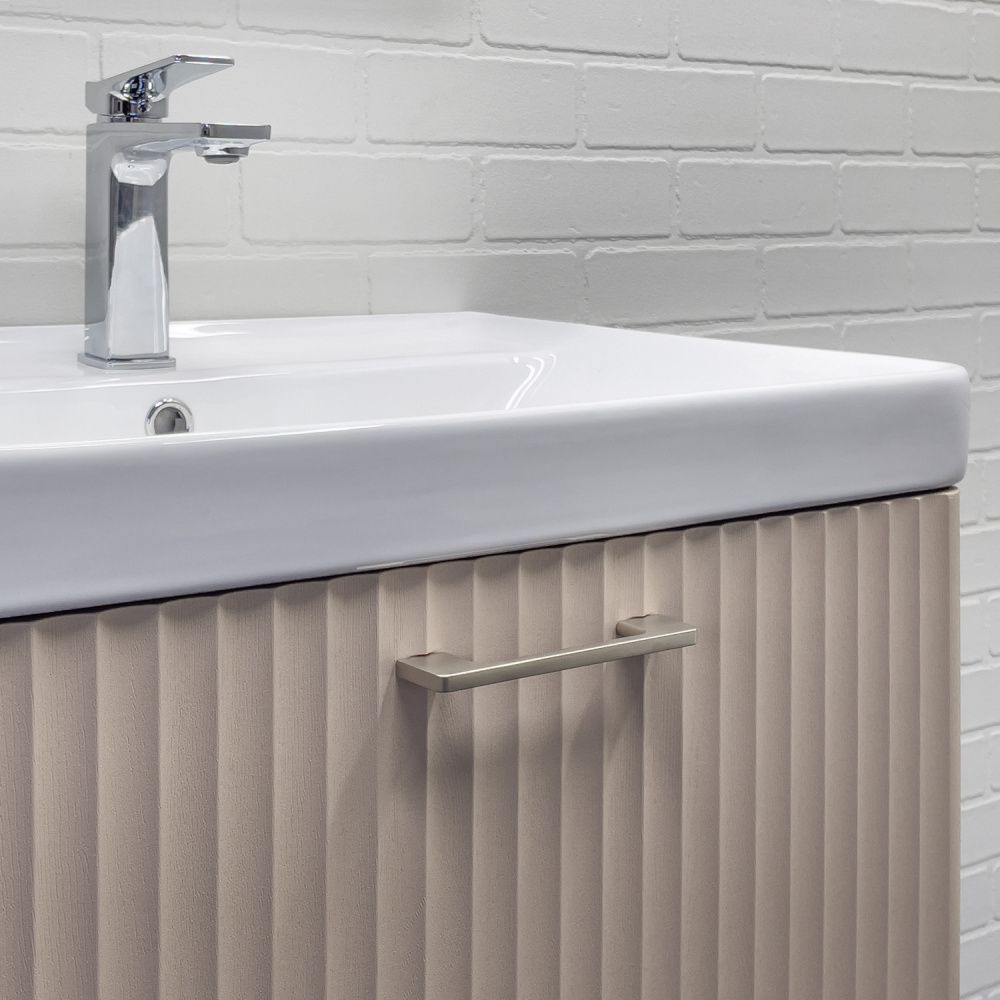 Подвесная тумба с одним большим выдвижным ящиком оборудованным системой плавного закрывания. Фасад и боковые стенки корпуса изготовлены из МДФ и покрыты декоративной пленкой с тиснением под дерево - дуб латте. Фрезеровка фасада выполнена в дорической форме. Внутренние детали тумбы выполнены из влагостойкого ЛДСП. Металлическая ручка скоба под естественный хват цвета жемчужный никель. Тумба подготовлена для подключения водоснабжения сзади и снизу.