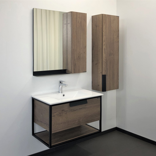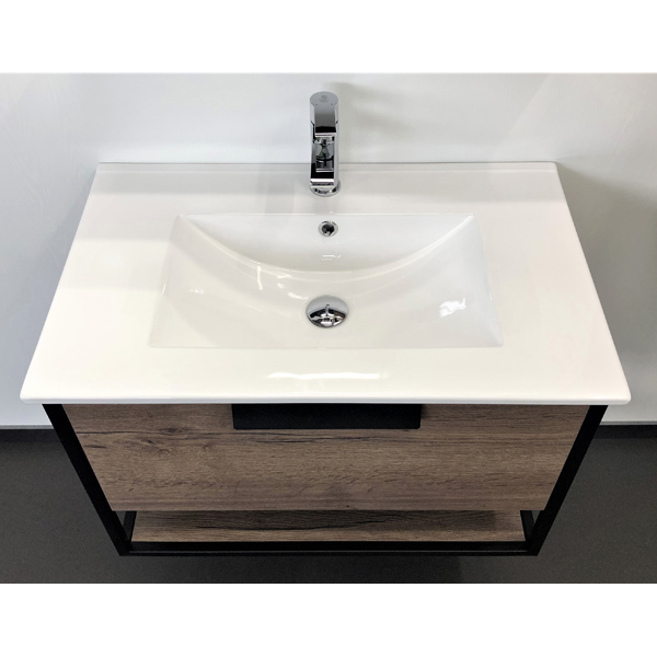 В основе тумбы - каркас из стального профиля окрашенный черной матовой эмалью. Белая керамическая раковина Comforty 75E из санфарфора.