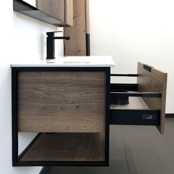 В основе тумбы - каркас из стального профиля окрашенный черной матовой эмалью. Керамическая раковина Quadro 90 из санфарфора.