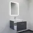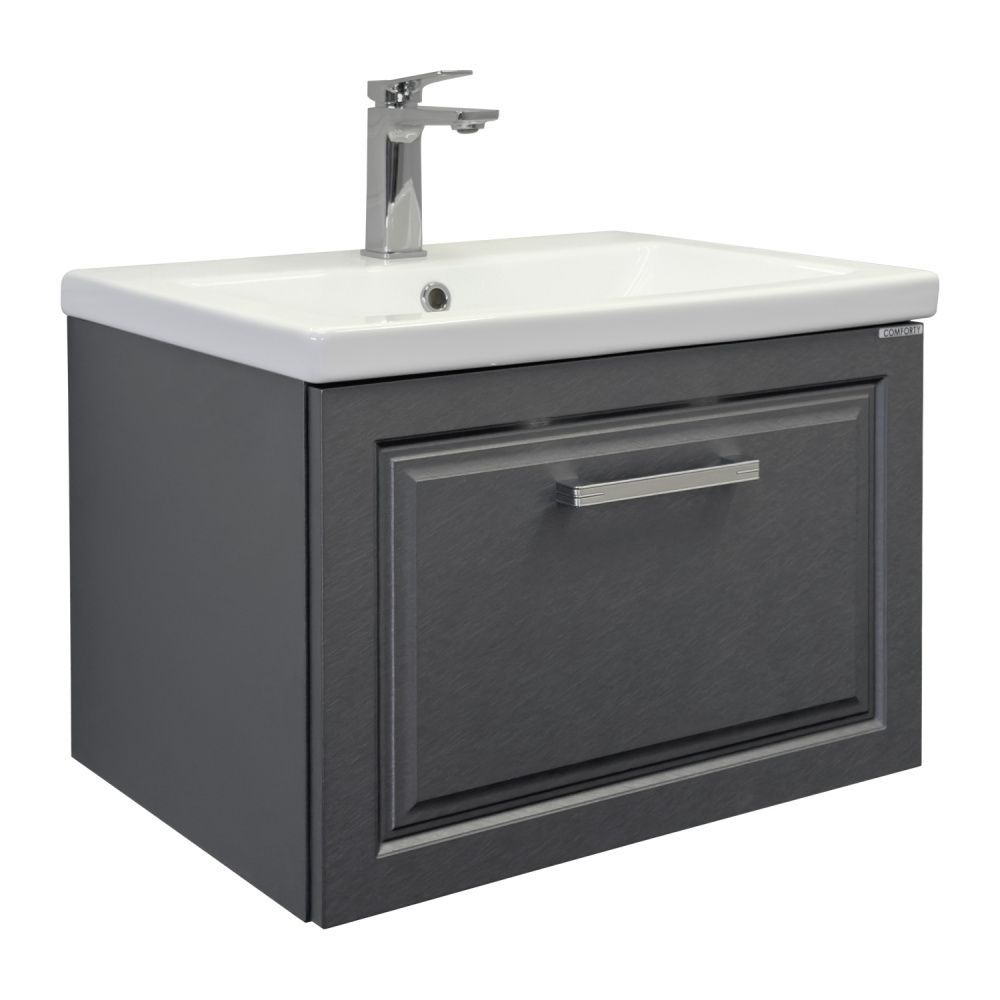 Подвесная тумба-умывальник шириной 60 см с одним выдвижным ящиком. Фасад ящика декорированы фрезеровкой по контуру. Ящик оснащен направляющими с механизмом плавного закрывания. В модели применяется матовая плёнка цвета оружейная сталь с эффектом браширования. Тумба подготовлена для подключения коммуникаций сзади и снизу.