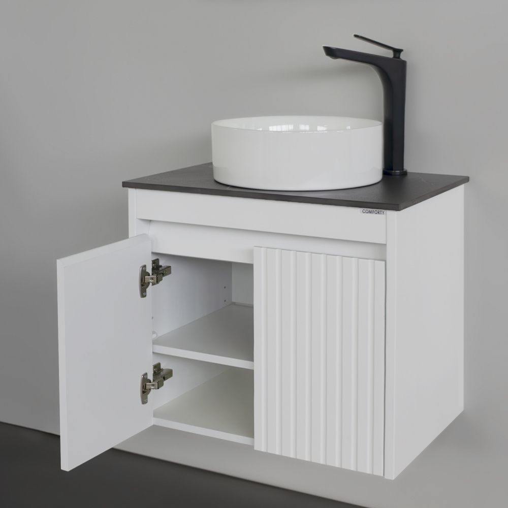 Тумба-умывальник Comforty Двина-60ПД белая матовая со столешницей мрамор Калакатта Блэк с раковиной 9111