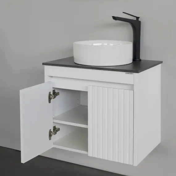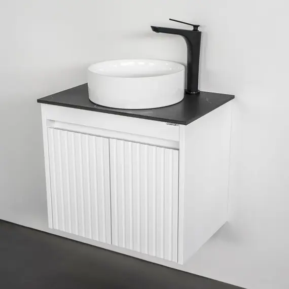 Комплектация: накладная керамическая раковина Comforty 9111, черная матовая столешница из керамогранита под мрамор Калакатта Блэк.