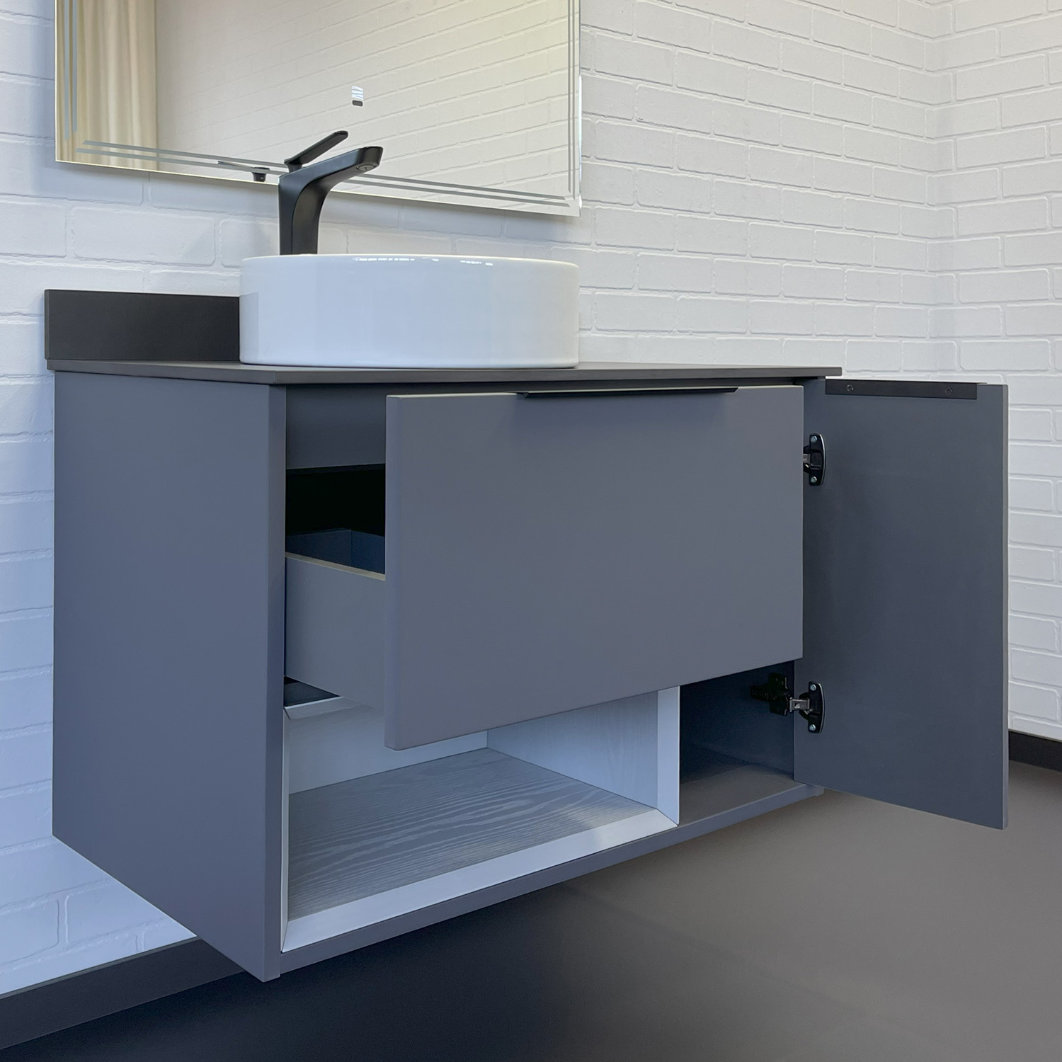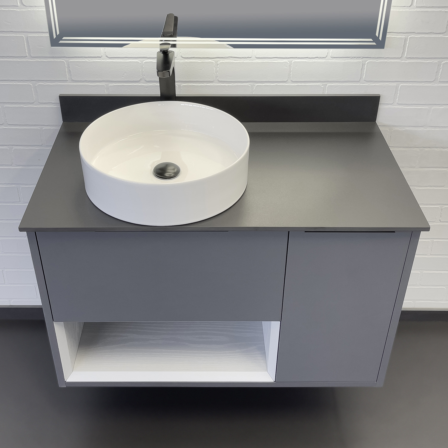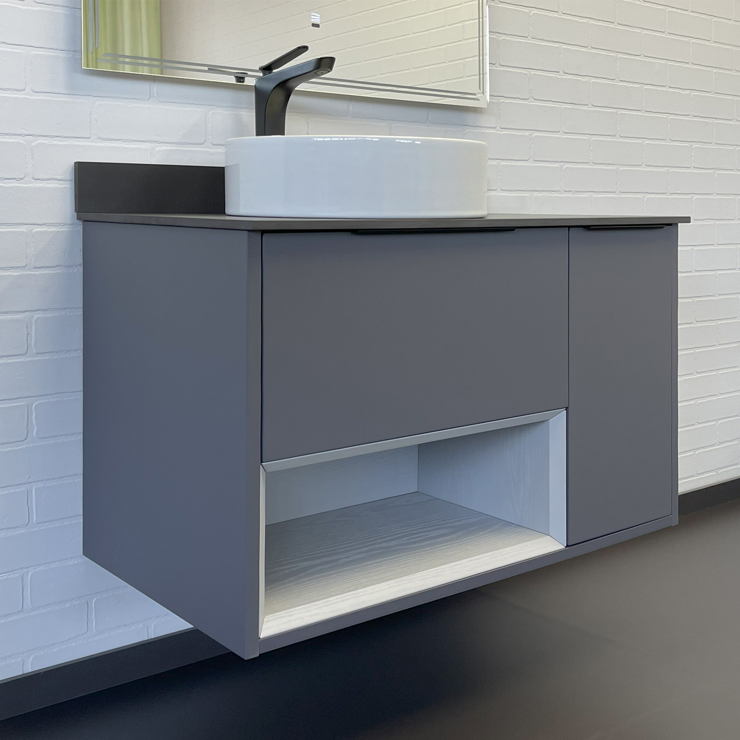 Подвесная тумба с одним ящиком и створкой оборудованными системой плавного закрывания. Предусмотрено пространство для открытого хранения. На фасадах тумбы черные матовые алюминиевые ручки. Прямоугольная раковина-чаша установлена на столешницу из керамогранита. В комплекте также пристенный плинтус. Ниша открытого хранения сделана из МДФ в пленке серого цвета с текстурой дерева. Торцы вставки спилены под углом.