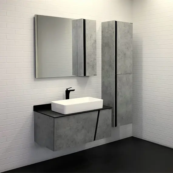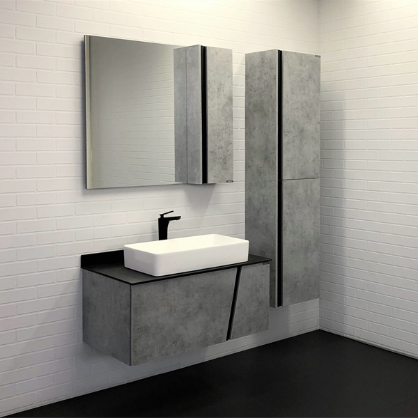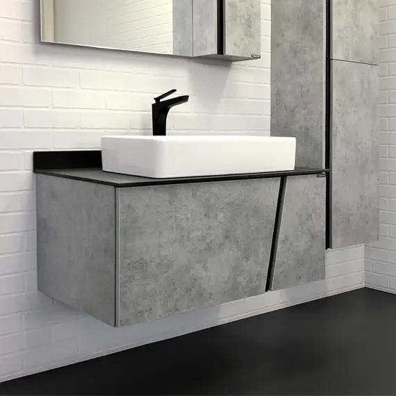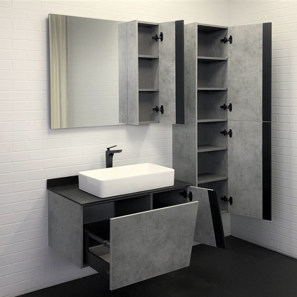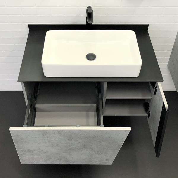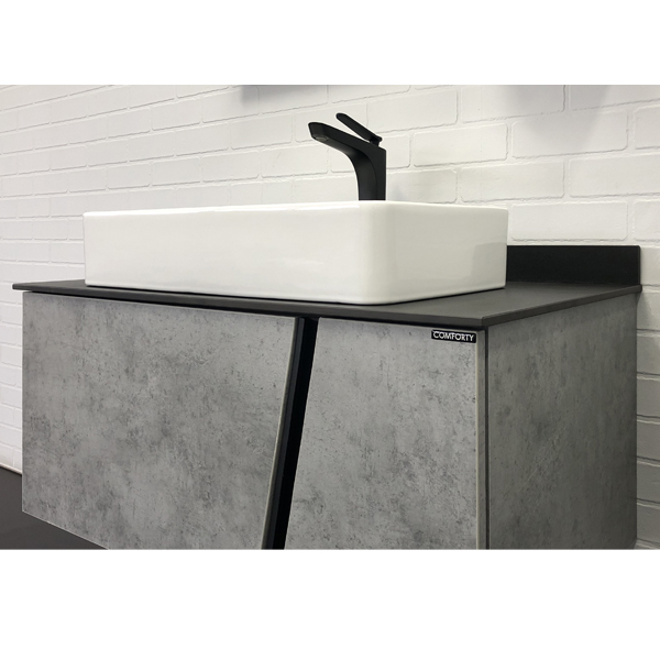 Тумба укомплектована столешницей и плинтусом из черного керамогранита и накладной прямоугольной раковиной Comforty 78189. Корпус и фасады тумбы изготовлена из влагостойкого ДСП цвета Бетон светлый. Тумба подготовлена для подключения водоснабжения снизу.