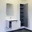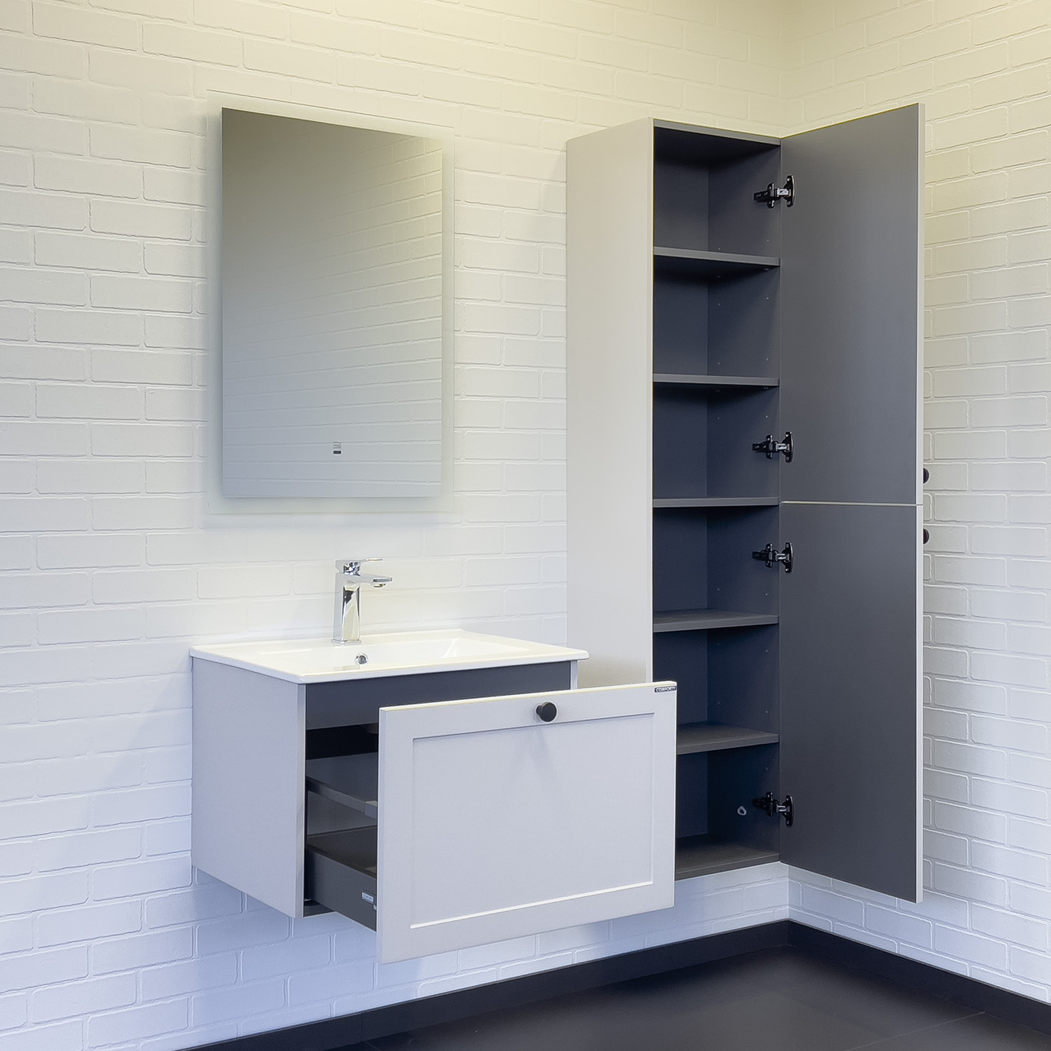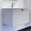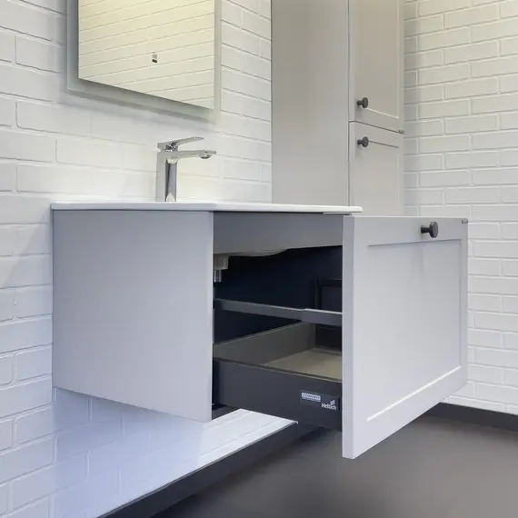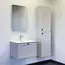 Подвесная тумба с одним выкатным ящиком оборудованным направляющими с системой плавного закрывания. Корпус тумбы изготовлены из влагостойкого ДСП. Фасад тумбы из МДФ фрезерован кантом по периметру. Корпус и фасад тумбы затянуты в матовую пленку цвета серый шёлк. Тумба подготовлена для подключения водоснабжения снизу и сзади.