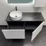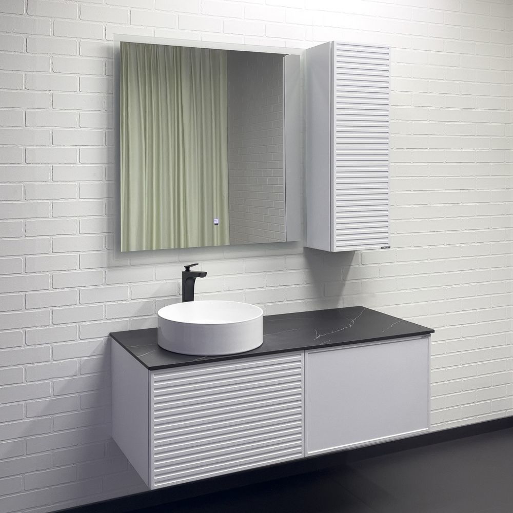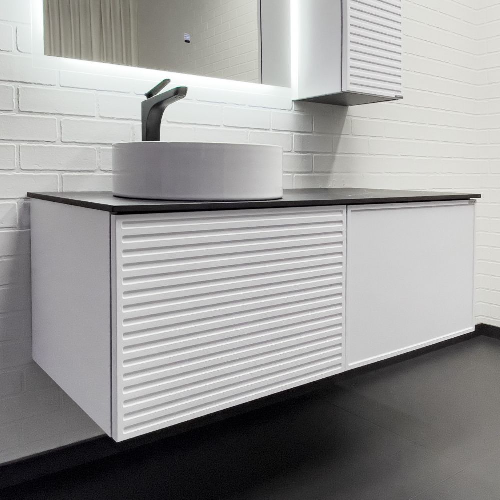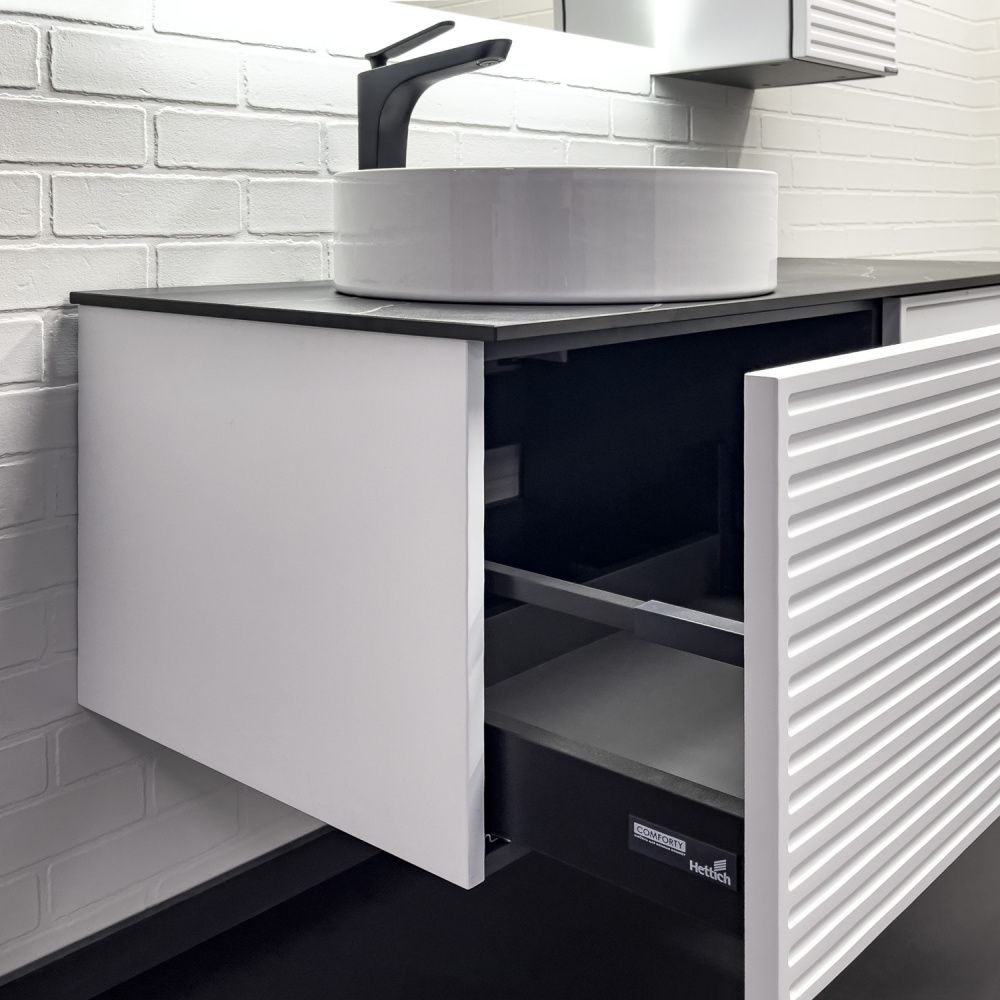 Подвесная тумба-умывальник с одним выкатным ящиком и створкой, система открывания при нажатии push-to-open. Фасад ящика декорирован горизонтальными профильными пазами. Створка и фасад окрашены белой матовой эмалью. Тумба подготовлена для подключения водоснабжения снизу и сзади.