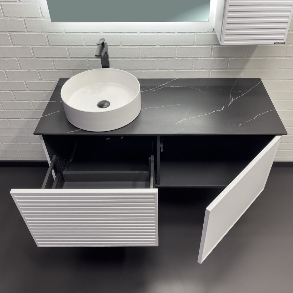 Комплектация: накладная раковина Comforty 9110 из фарфора, столешница из керамогранита Калакатта Блэк.