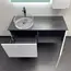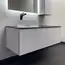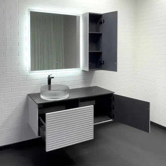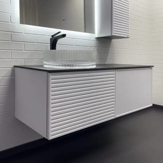 Подвесная тумба-умывальник с одним выкатным ящиком и створкой, система открывания при нажатии push-to-open. Фасад ящика декорирован горизонтальными профильными пазами. Створка и фасад окрашены белой матовой эмалью. Тумба подготовлена для подключения водоснабжения снизу и сзади.