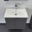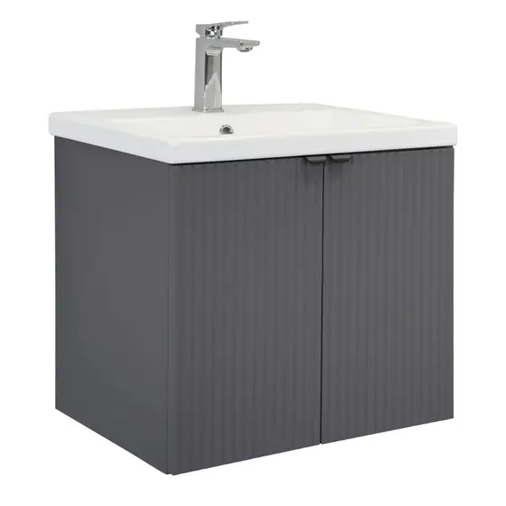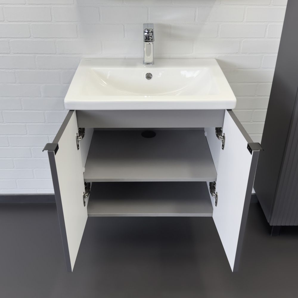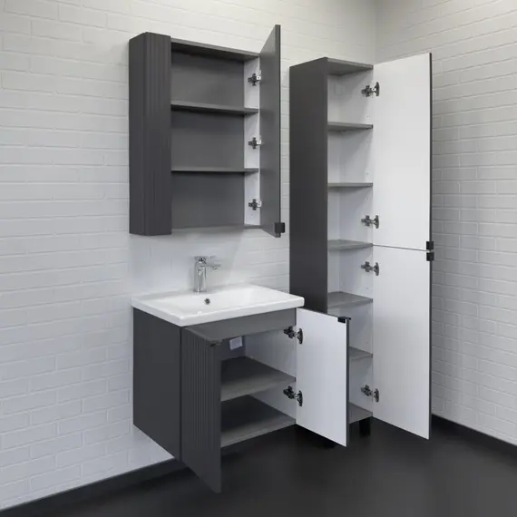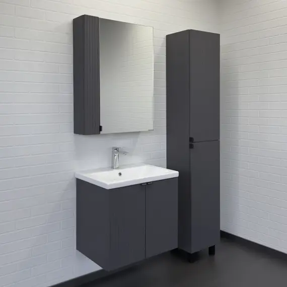 Подвесная тумба-умывальник шириной 60 см с двумя распашными створками декорированными вертикальной фрезеровкой. Створки оснащены петлями плавного закрывания. За створками одна полка. В модели применяется матовая плёнка цвета антрацит с эффектом Soft-Touch.