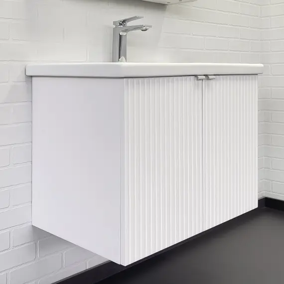 Подвесная тумба-умывальник с двумя распашными створками декорированными вертикальной фрезеровкой. Створки оснащены петлями плавного закрывания. За створками одна полка. В модели применяется матовая плёнка белого цвета с эффектом Soft-Touch.