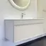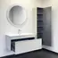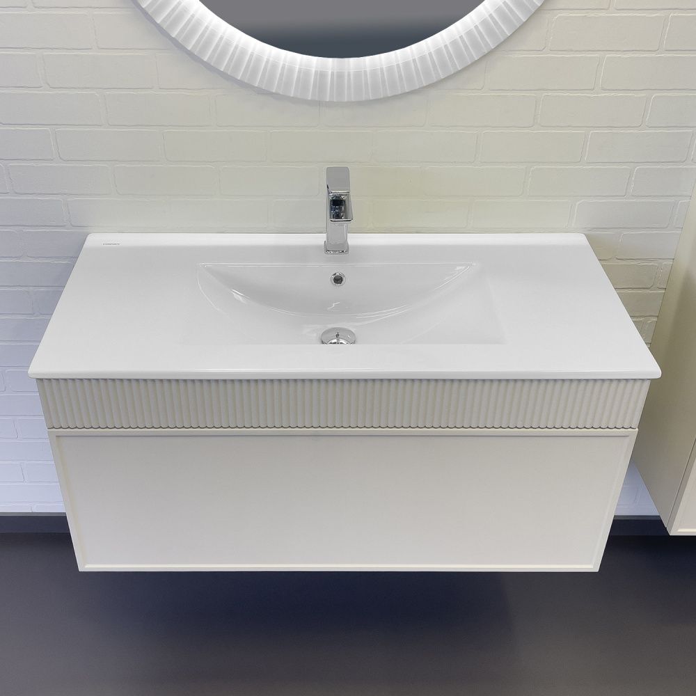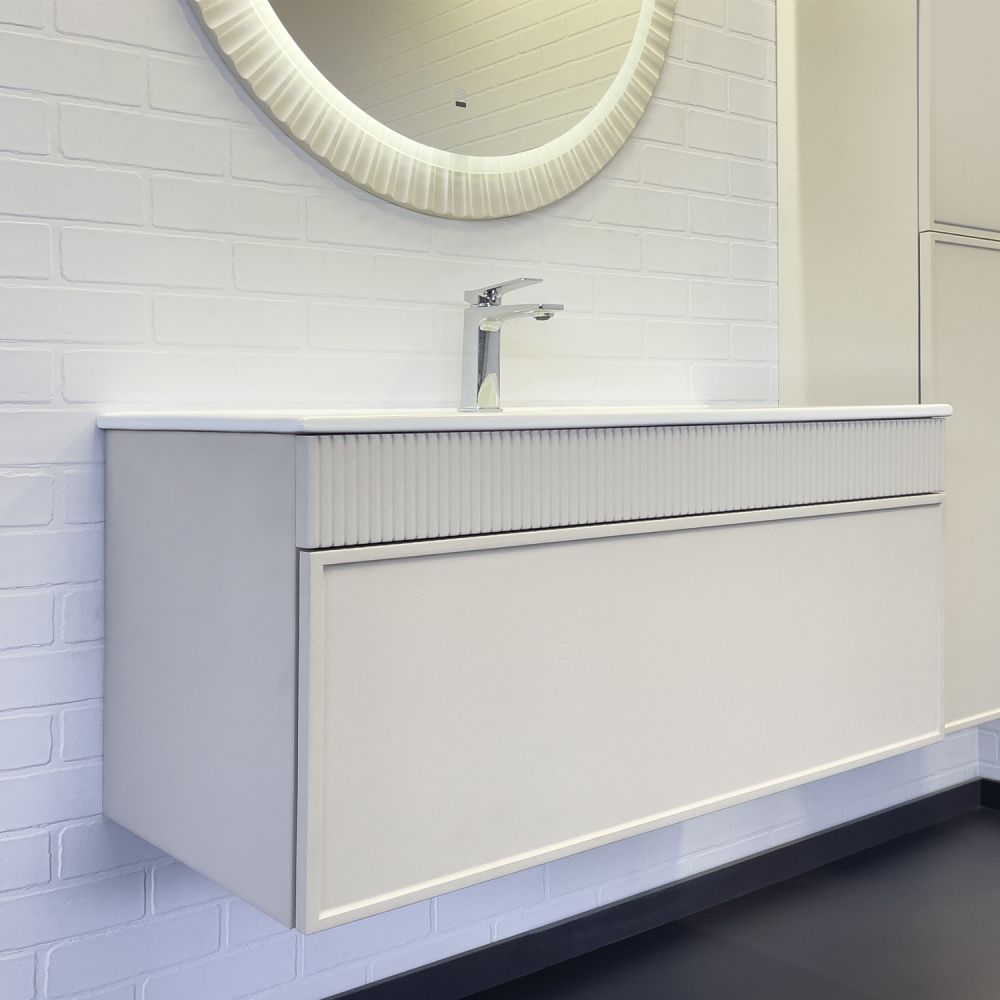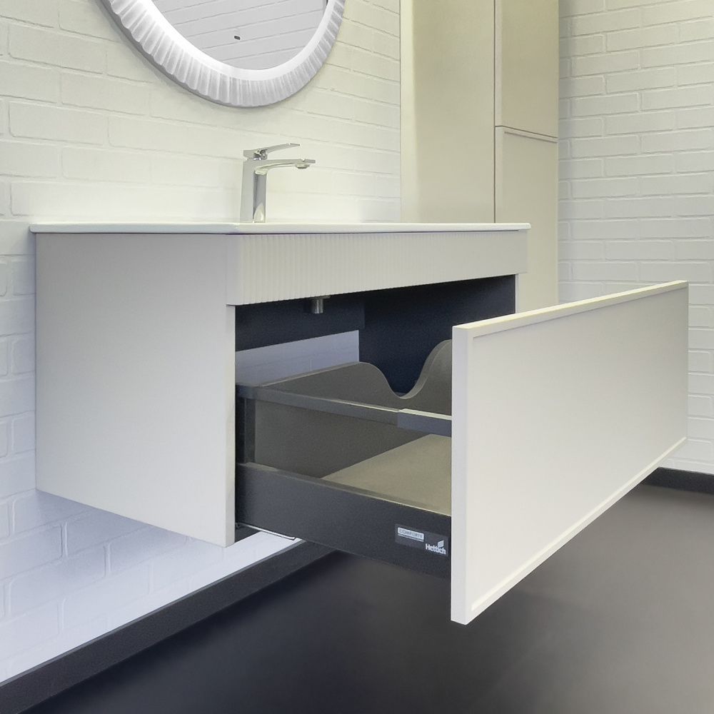 Подвесная тумба с одним большим выкатным ящиком оборудованным направляющими с системой плавного закрывания. Корпус тумбы изготовлены из влагостойкого ЛДСП. Фасад тумбы из МДФ фрезерован кантом по периметру. Подпорная царга фрезерована вертикальным узором. Корпус и фасад тумбы затянуты в матовую пленку цвета серый шёлк. Тумба подготовлена для подключения водоснабжения снизу и сзади.