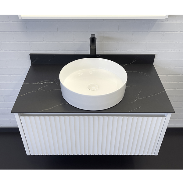 Комплектация: накладная керамическая раковина Comforty 9110, черная матовая столешница из керамогранита под мрамор Калакатта Блэк с бортиком.