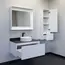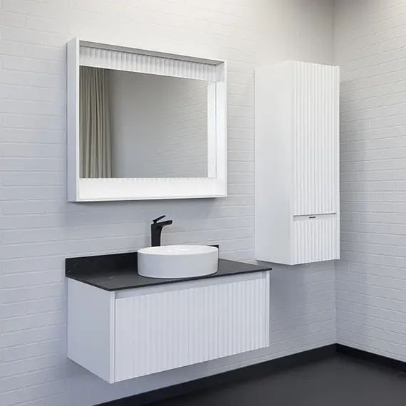 Фасад тумбы из МДФ фрезерован геометрическим узором с имитацией волны и окрашен белой матовой эмалью.