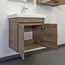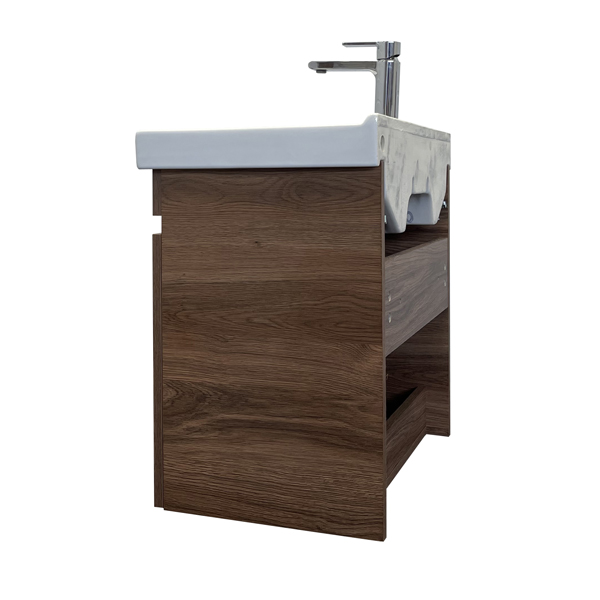 Тумба укомплектована керамической раковиной и подготовлена к подключению коммуникаций из стены и из пола.