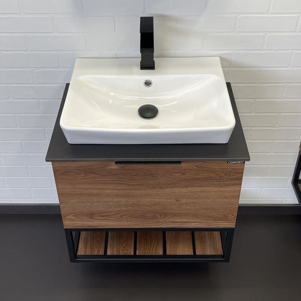 Тумба-умывальник Comforty Порто-60 дуб тёмно-коричневый с черной столешницей c раковиной Comforty 9055RA-50