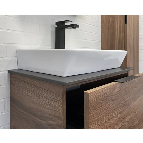 Комплектация: накладная прямоугольная раковина Comforty 9055RA-50, столешница из черного керамогранита. Тумба подготовлена для подключения водоснабжения снизу.