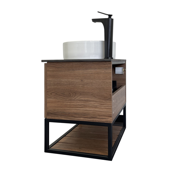Комплектация: накладная круглая раковина Comforty 9111, столешница из черного керамогранита. Тумба подготовлена для подключения водоснабжения снизу.