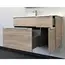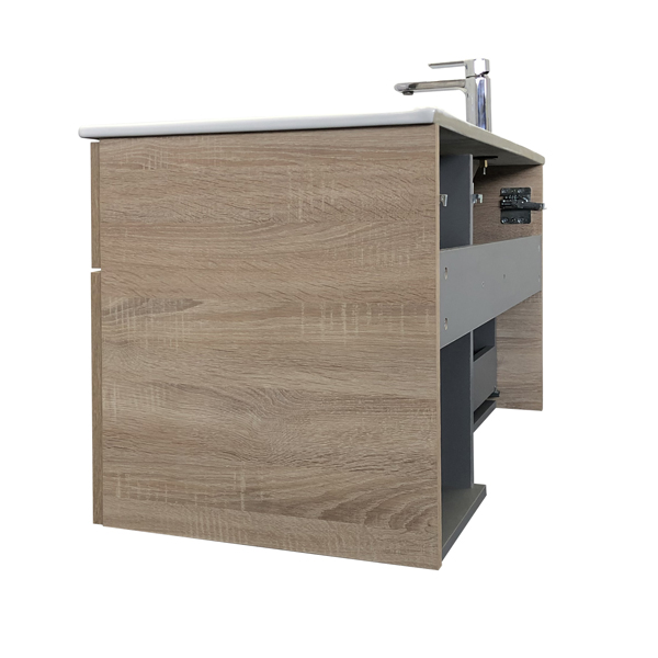 Подвесная тумба с одним большим, одним малым выкатными ящиками и малой створкой оборудованными системами плавного закрывания. Корпус и фасад тумбы изготовлены из влагостойкого ДСП, созданного по уникальной технологии «Синхронное тиснение» в декоре «дуб сонома».