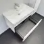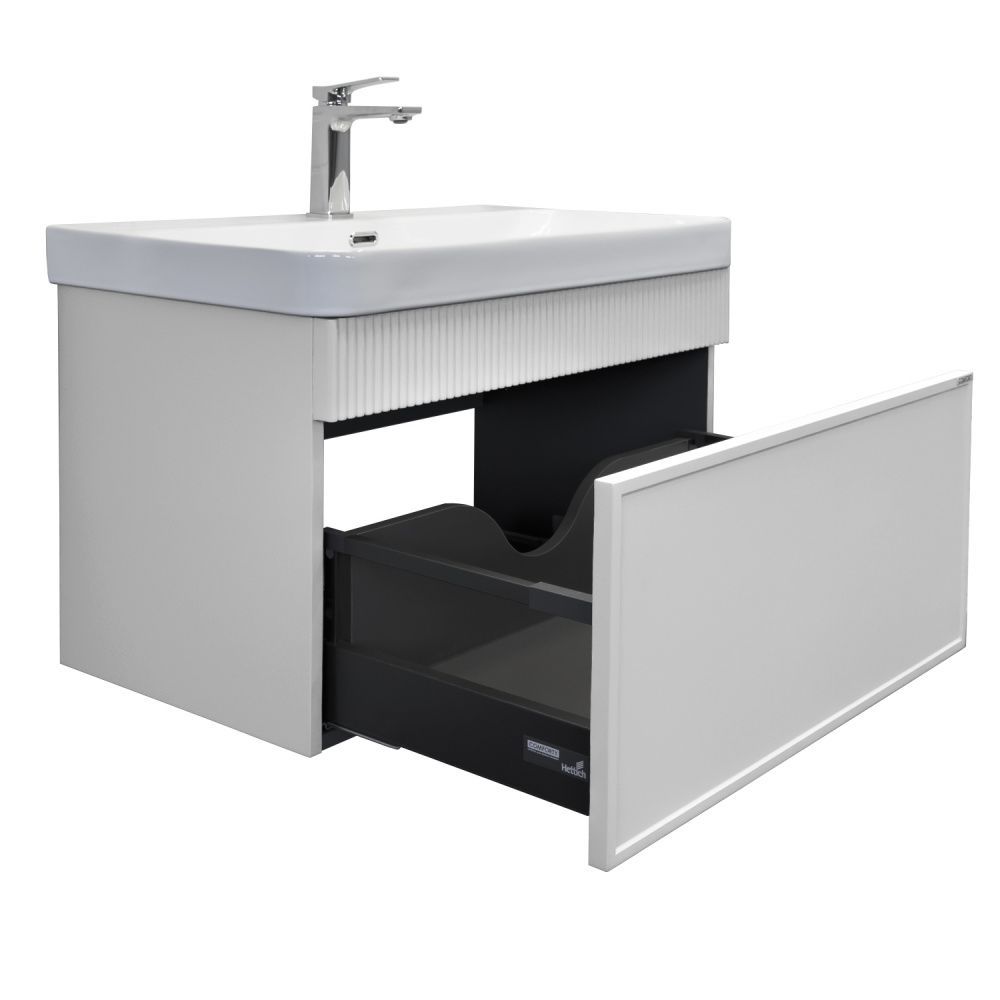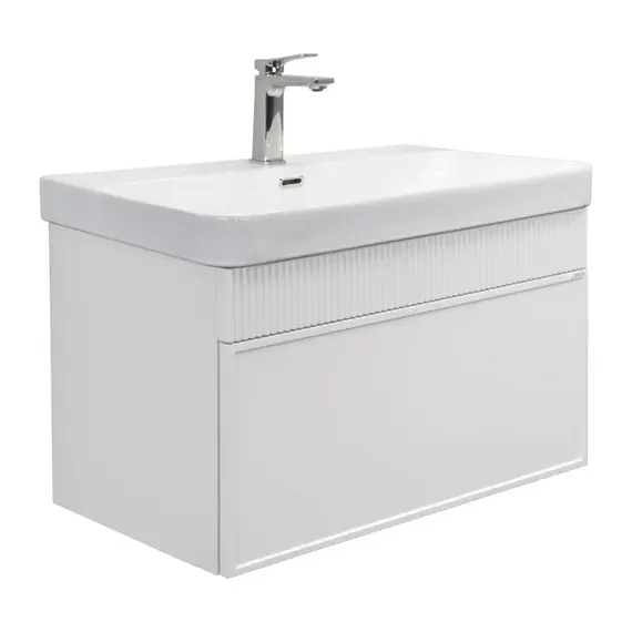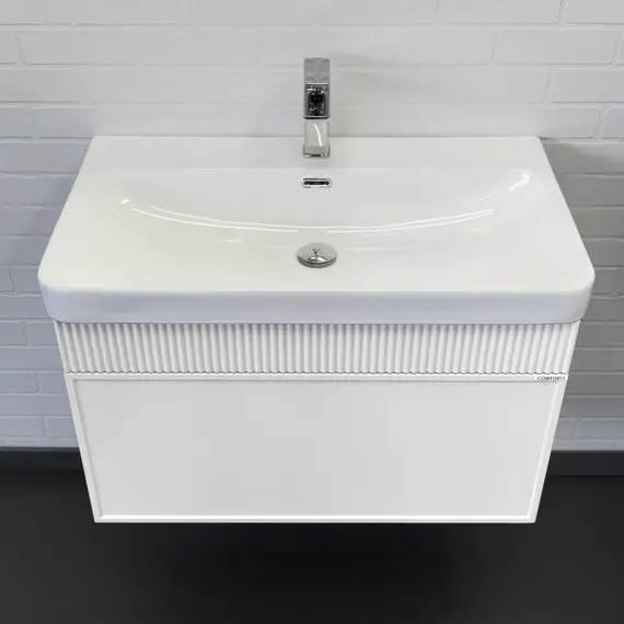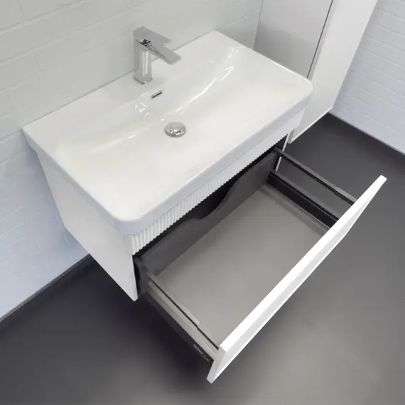 Подвесная тумба с одним большим выкатным ящиком оборудованным направляющими с системой плавного закрывания. Корпус тумбы изготовлены из влагостойкого ЛДСП. Фасад тумбы из МДФ фрезерован кантом по периметру. Подпорная царга фрезерована вертикальным узором. Корпус и фасад тумбы окрашены белой матовой эмалью. Тумба подготовлена для подключения водоснабжения снизу и сзади.
