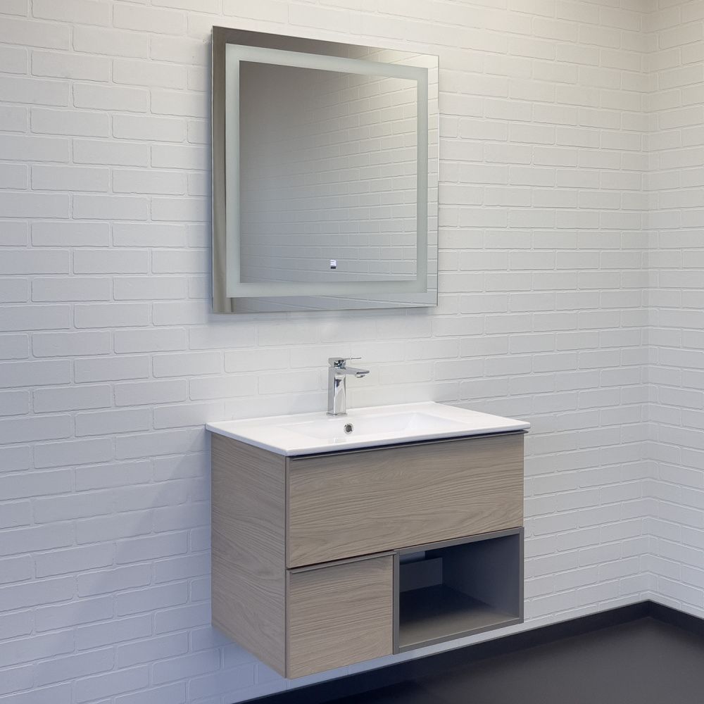 Тумба-умывальник в современном стиле с двумя выкатными ящиками и пространством для открытого хранения. Корпус и фасады тумбы изготовлены из влагостойкого ЛДСП в древесном декоре дуб светлый. Ящики оснащены системой плавного закрывания. Тумба укомплектована хромированными матовыми алюминиевыми ручками и накладной прямоугольной раковиной из санфарфора.